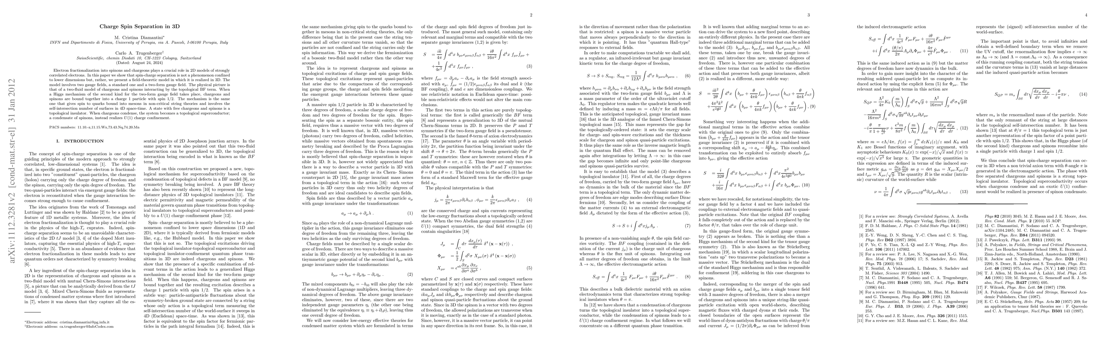 Researchers show that spin-charge separation occurs in 3D due to a novel field-theoretic model involving two gauge fields and topological interactions, leading to the formation of chargeons and spinons and their unique properties.