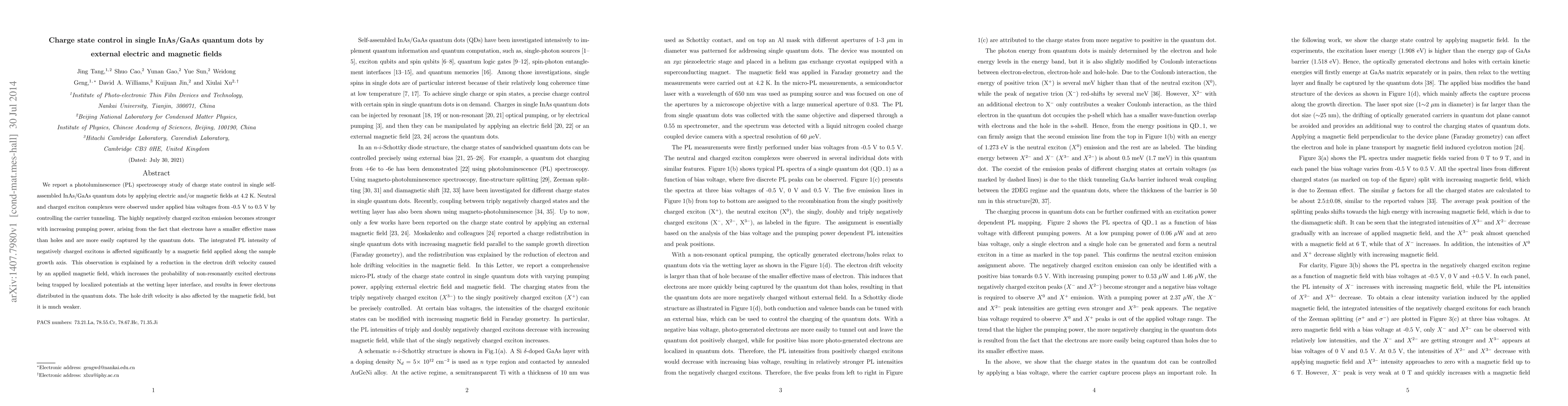 This study investigates charge state control in single InAs/GaAs quantum dots using photoluminescence spectroscopy under electric and magnetic fields. The results show that negatively charged excitons are more prevalent with higher pumping power and are significantly influenced by magnetic fields, which reduce electron drift and increase trapping at the wetting layer interface.