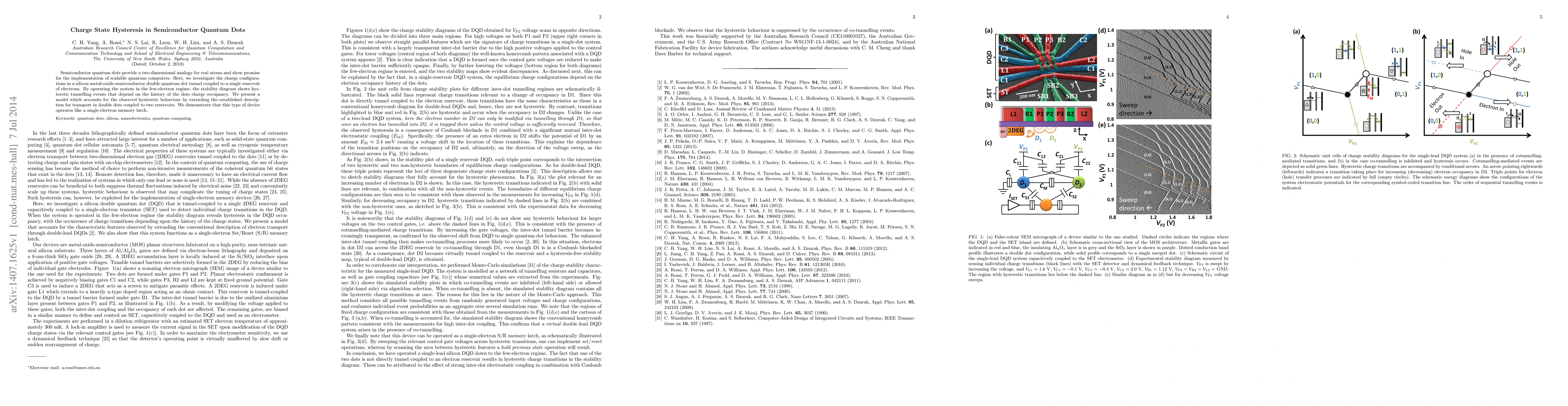 Semiconductor quantum dots provide a two-dimensional analogy for real atoms and show promise for the implementation of scalable quantum computers. Here, we investigate the charge configurations in a silicon metal-oxide-semiconductor double quantum dot tunnel coupled to a single reservoir of electrons. By operating the system in the few-electron regime, the stability diagram shows hysteretic tunnelling events that depend on the history of the dots charge occupancy. We present a model which accounts for the observed hysteretic behaviour by extending the established description for transport in double dots coupled to two reservoirs. We demonstrate that this type of device operates like a single-electron memory latch.