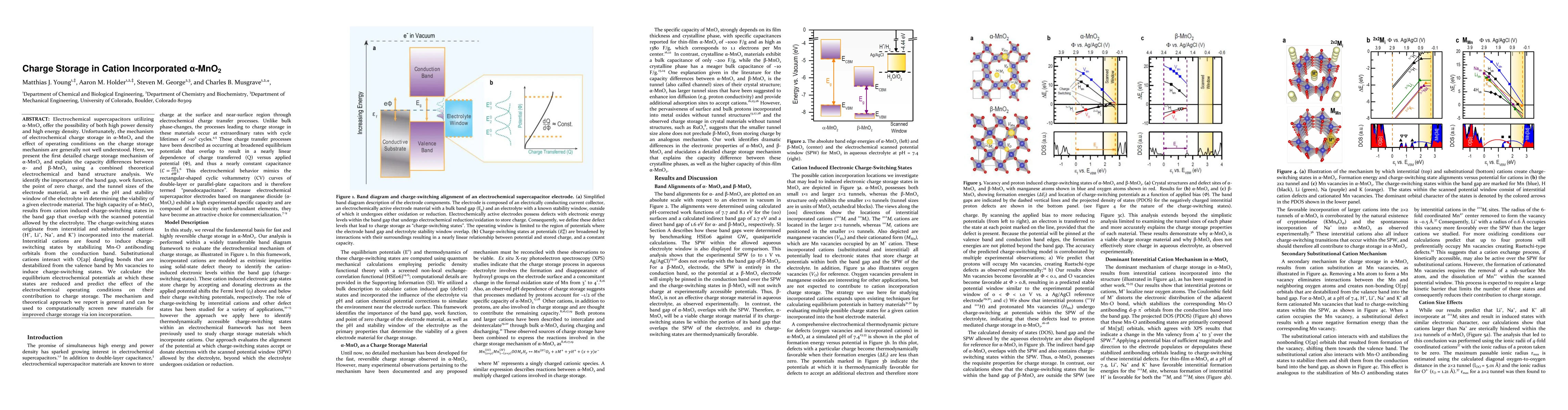 Electrochemical supercapacitors utilizing {\alpha}-MnO2 offer the possibility of both high power density and high energy density. Unfortunately, the mechanism of electrochemical charge storage in {\alpha}-MnO2 and the effect of operating conditions on the charge storage mechanism are generally not well understood. Here, we present the first detailed charge storage mechanism of {\alpha}-MnO2 and explain the capacity differences between {\alpha}- and {\beta}-MnO2 using a combined theoretical electrochemical and band structure analysis. We identify the importance of the band gap, work function, the point of zero charge, and the tunnel sizes of the electrode material, as well as the pH and stability window of the electrolyte in determining the viability of a given electrode material. The high capacity of {\alpha}-MnO2 results from cation induced charge-switching states in the band gap that overlap with the scanned potential allowed by the electrolyte. The charge-switching states originate from interstitial and substitutional cations (H+, Li+, Na+, and K+) incorporated into the material. Interstitial cations are found to induce charge-switching states by stabilizing Mn-O antibonding orbitals from the conduction band. Substitutional cations interact with O[2p] dangling bonds that are destabilized from the valence band by Mn vacancies to induce charge-switching states. We calculate the equilibrium electrochemical potentials at which these states are reduced and predict the effect of the electrochemical operating conditions on their contribution to charge storage. The mechanism and theoretical approach we report is general and can be used to computationally screen new materials for improved charge storage via ion incorporation.