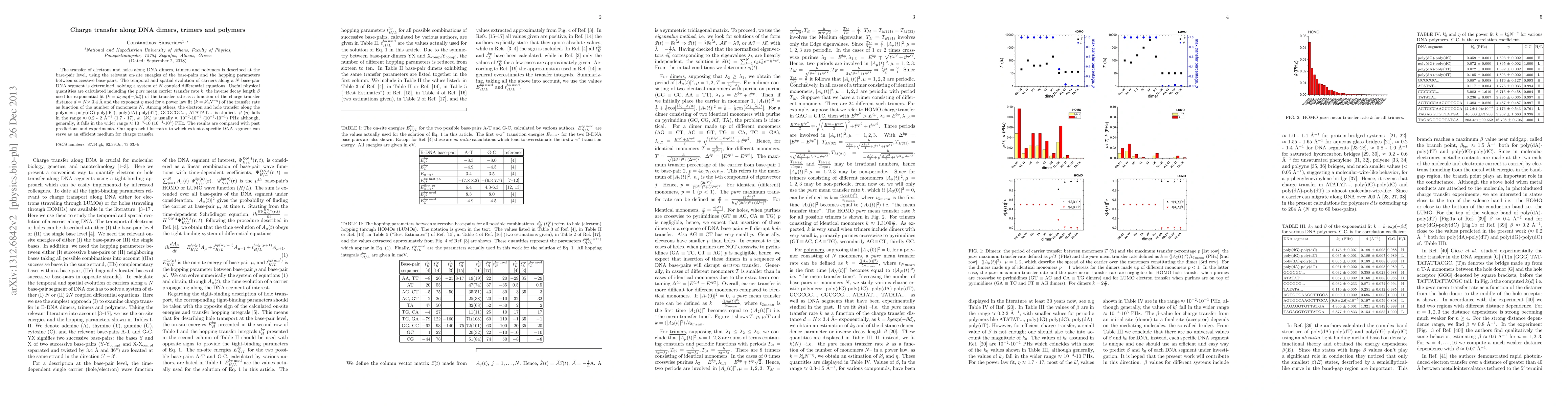 The transfer of electrons and holes along DNA dimers, trimers and polymers is described at the base-pair level, using the relevant on-site energies of the base-pairs and the hopping parameters between successive base-pairs. The temporal and spatial evolution of carriers along a $N$ base-pair DNA segment is determined, solving a system of $N$ coupled differential equations. Useful physical quantities are calculated including the pure mean carrier transfer rate $k$, the inverse decay length $\beta$ used for exponential fit ($k = k_0 \textrm{exp}(-\beta d)$) of the transfer rate as a function of the charge transfer distance $d = N \times$ 3.4 {\AA} and the exponent $\eta$ used for a power law fit ($k = k_0' N^{-\eta}$) of the transfer rate as function of the number of monomers $N$. Among others, the electron and hole transfer along the polymers poly(dG)-poly(dC), poly(dA)-poly(dT), GCGCGC..., ATATAT... is studied. $\beta$ ($\eta$) falls in the range $\approx$ 0.2 - 2 {\AA}$^{-1}$ (1.7 - 17), $k_0$ ($k_0'$) is usually $\approx 10^{-2}$-10$^{-1}$ ($ 10^{-2}$-10$^{-1}$) PHz although, generally, it falls in the wider range $\approx 10^{-4}$-10 ($10^{-4}$-10$^3$) PHz. The results are compared with past predictions and experiments. Our approach illustrates to which extent a specific DNA segment can serve as an efficient medium for charge transfer.