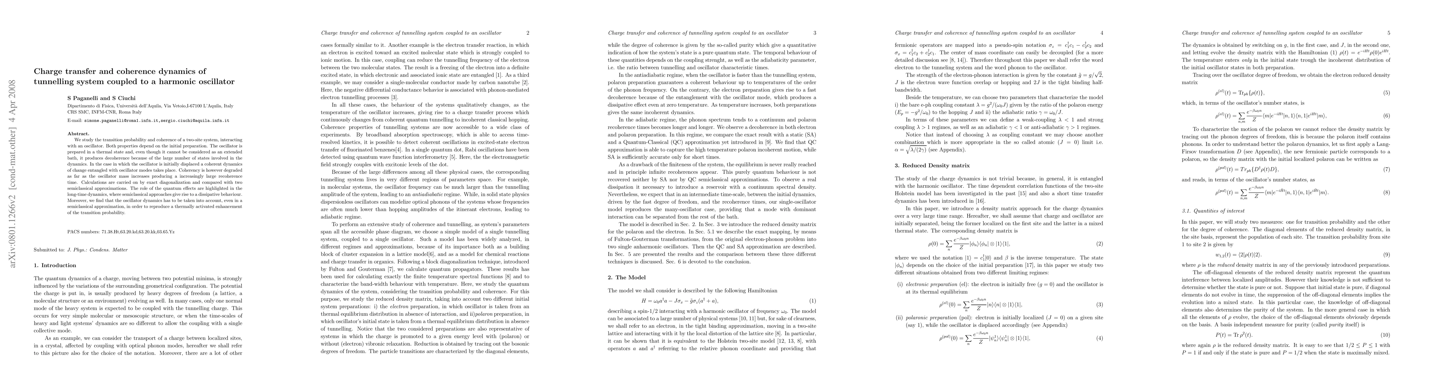 We study the transition probability and coherence of a two-site system, interacting with an oscillator. Both properties depend on the initial preparation. The oscillator is prepared in a thermal state and, even though it cannot be considered as an extended bath, it produces decoherence because of the large number of states involved in the dynamics. In the case in which the oscillator is intially displaced a coherent dynamics of change entangled with oscillator modes takes place. Coherency is however degraded as far as the oscillator mass increases producing a increasingly large recoherence time. Calculations are carried on by exact diagonalization and compared with two semiclassical approximations. The role of the quantum effects are highlighted in the long-time dynamics, where semiclassical approaches give rise to a dissipative behaviour. Moreover, we find that the oscillator dynamics has to be taken into account, even in a semiclassical approximation, in order to reproduce a thermally activated enhancement of the transition probability.