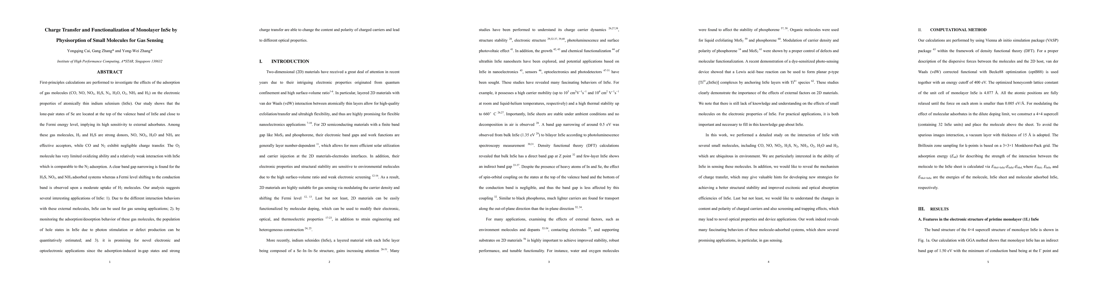 This study investigates the electronic properties of monolayer InSe under the adsorption of various gas molecules using first-principles calculations. The findings suggest that InSe exhibits high sensitivity to external adsorbates due to its lone-pair states, enabling potential applications in gas sensing and novel electronic/optoelectronic devices through charge transfer and functionalization.