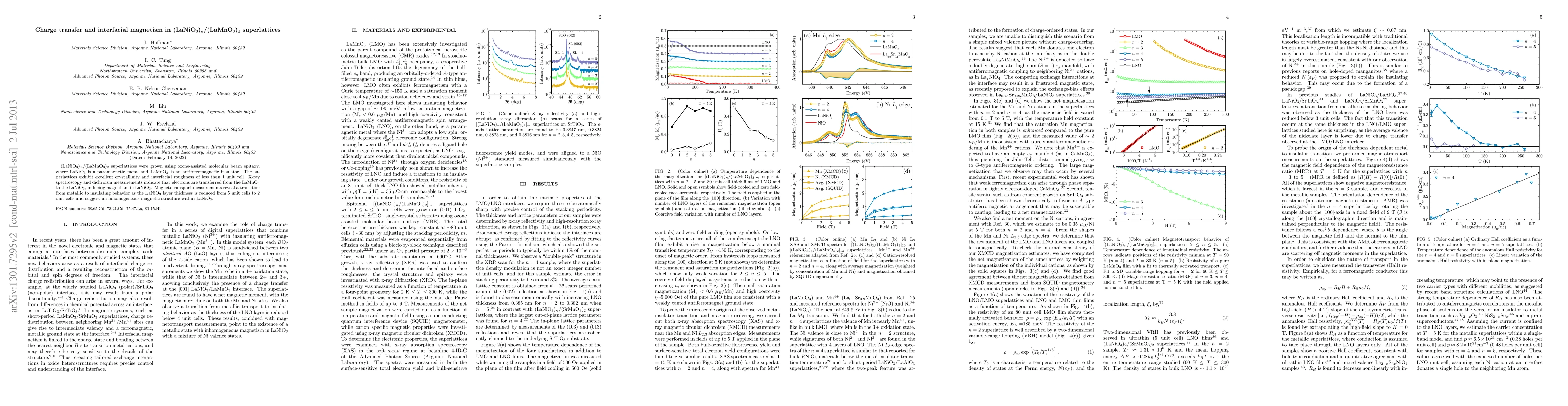 This study investigates (LaNiO3)n/(LaMnO3)2 superlattices grown via ozone-assisted molecular beam epitaxy, revealing electron transfer from LaMnO3 to LaNiO3 that induces magnetism in the latter. Magnetotransport measurements indicate a transition from metallic to insulating behavior as LaNiO3 layer thickness decreases, suggesting a modulated magnetic structure.