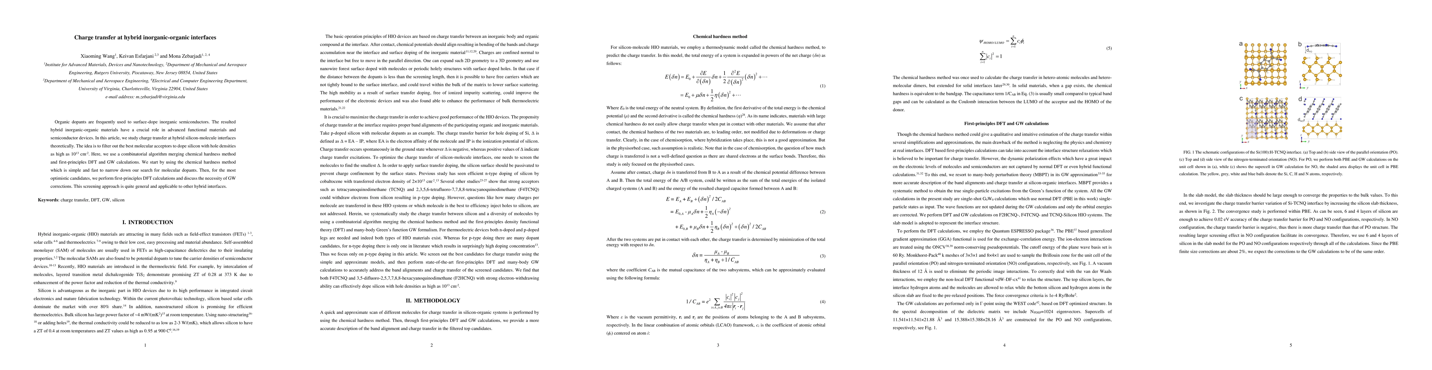 Organic dopants are frequently used to surface-dope inorganic semiconductors. The resulted hybrid inorganic-organic materials have a crucial role in advanced functional materials and semiconductor devices. In this article, we study charge transfer at hybrid silicon-molecule interfaces theoretically. The idea is to filter out the best molecular acceptors to dope silicon with hole densities as high as 1013 cm-2. Here, we use a combinatorial algorithm merging chemical hardness method and first-principles DFT and GW calculations. We start by using the chemical hardness method which is simple and fast to narrow down our search for molecular dopants. Then, for the most optimistic candidates, we perform first-principles DFT calculations and discuss the necessity of GW corrections. This screening approach is quite general and applicable to other hybrid interfaces.