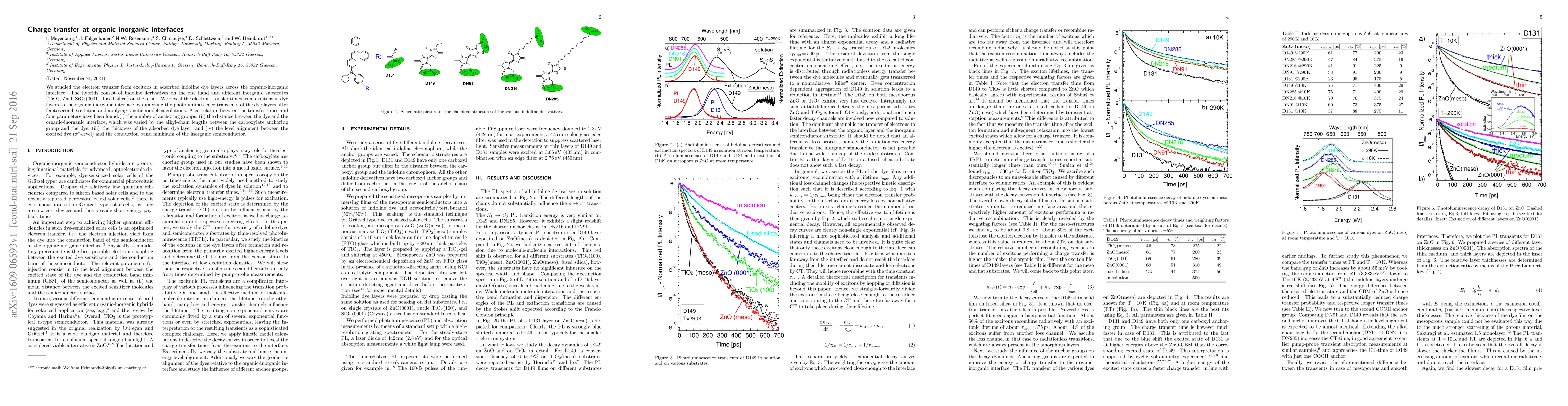 The study examines electron transfer from excitons in adsorbed indoline dye layers across organic-inorganic interfaces using photoluminescence transients and kinetic model calculations.