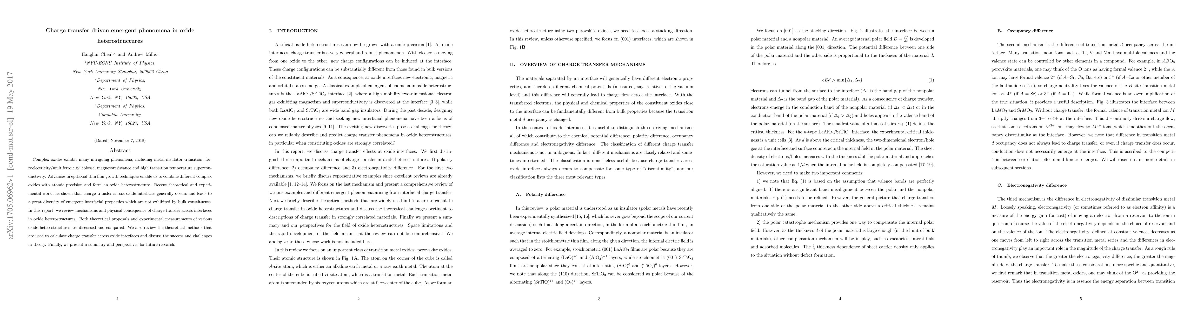 This paper reviews charge transfer phenomena in oxide heterostructures, detailing how interface-driven charge transfer leads to diverse emergent properties like metal-insulator transitions and multiferroicity. It compares theoretical methods and experimental measurements, discussing their successes and challenges, and offers future research perspectives.