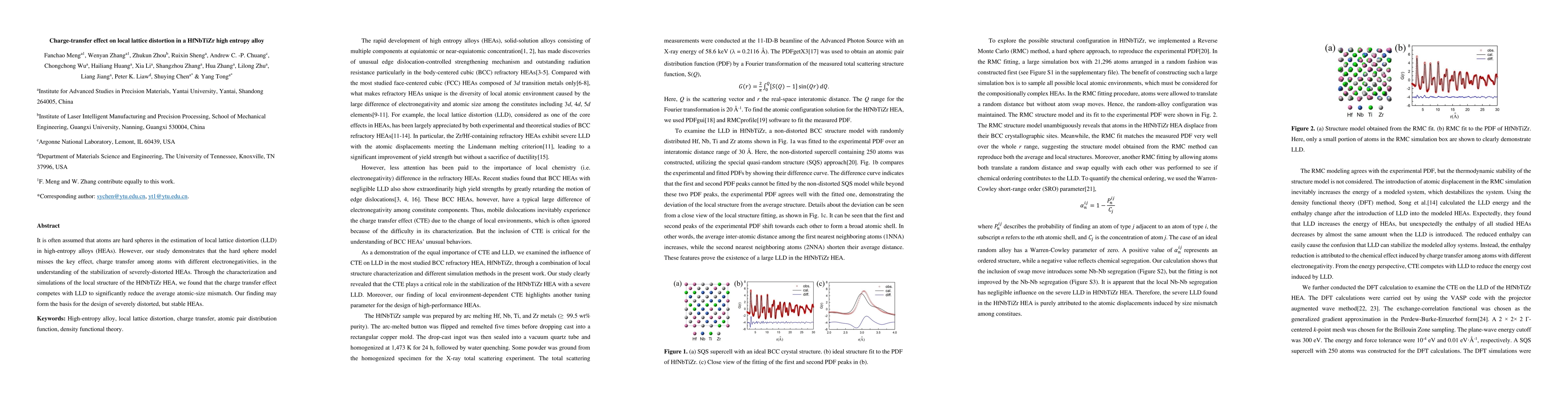It is often assumed that atoms are hard spheres in the estimation of local lattice distortion (LLD) in high-entropy alloys (HEAs). However, our study demonstrates that the hard sphere model misses the key effect, charge transfer among atoms with different electronegativities, in the understanding of the stabilization of severely-distorted HEAs. Through the characterization and simulations of the local structure of the HfNbTiZr HEA, we found that the charge transfer effect competes with LLD to significantly reduce the average atomic-size mismatch. Our finding may form the basis for the design of severely distorted, but stable HEAs.