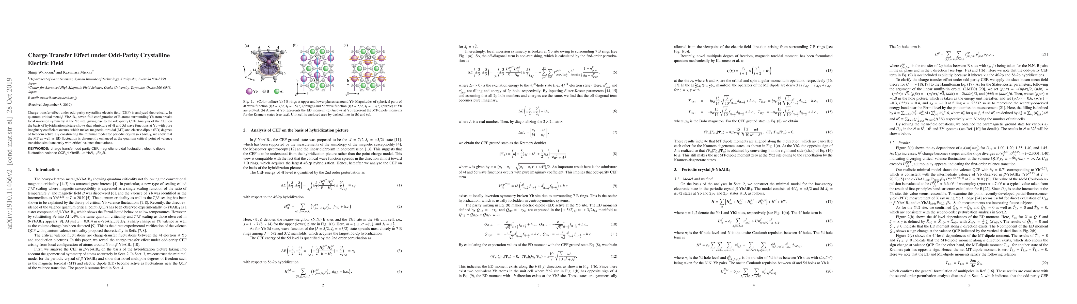 Charge-transfer effect under odd-parity crystalline electric field (CEF) is analyzed theoretically. In quantum-critical metal $\beta$-YbAlB$_4$, seven-fold configuration of B atoms surrounding Yb atom breaks local inversion symmetry at the Yb site, giving rise to the odd-parity CEF. Analysis of the CEF on the basis of hybridization picture shows that admixture of 4f and 5d wave functions at Yb with pure imaginary coefficient occurs, which makes magnetic-toroidal (MT) and electric-dipole (ED) degrees of freedom active. By constructing the minimal model for periodic crystal $\beta$-YbAlB$_4$, we show that the MT as well as ED fluctuation is divergently enhanced at the quantum critical point of valence transition simultaneously with critical valence fluctuations.
