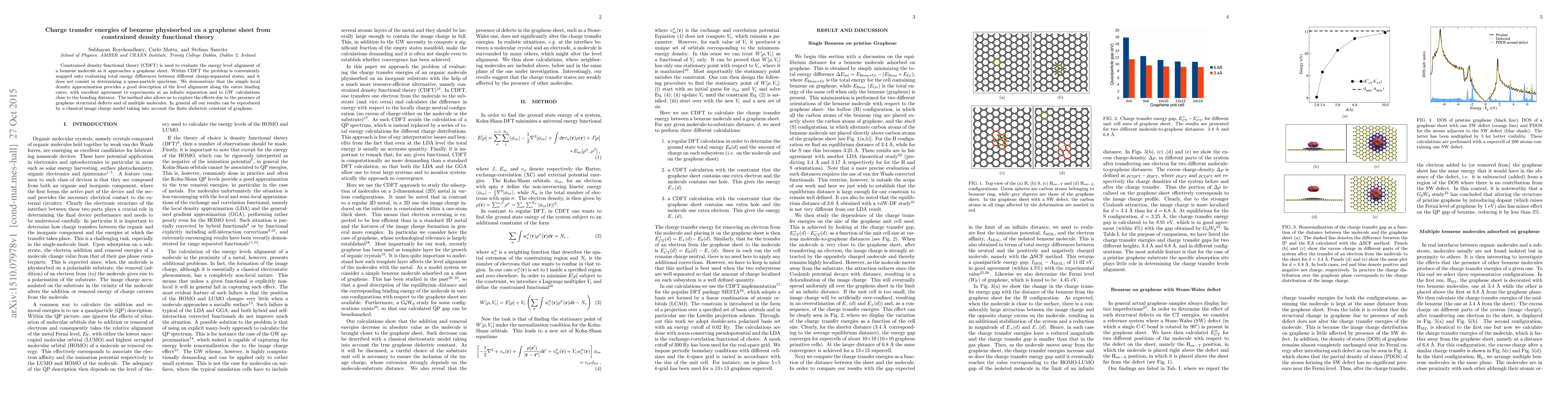 A study using constrained density functional theory found that a benzene molecule can accurately predict its charge transfer energies when physisorbed on a graphene sheet, with good agreement to experiments and other methods.