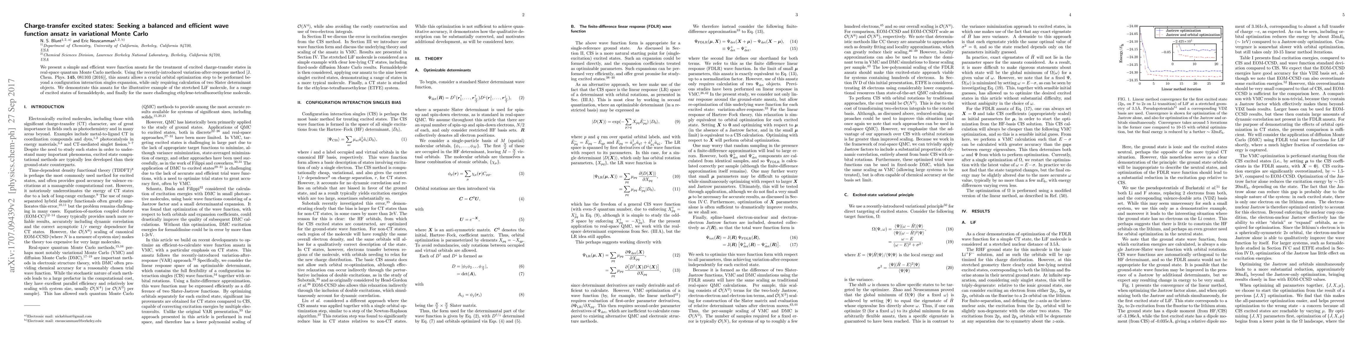 This paper proposes a new wave function ansatz for efficiently treating excited charge-transfer states in quantum Monte Carlo methods, utilizing the variation-after-response technique. The method optimizes orbitals beyond a configuration interaction singles expansion with minimal computational cost, demonstrated through examples including LiF, formaldehyde, and ethylene-tetrafluoroethylene.