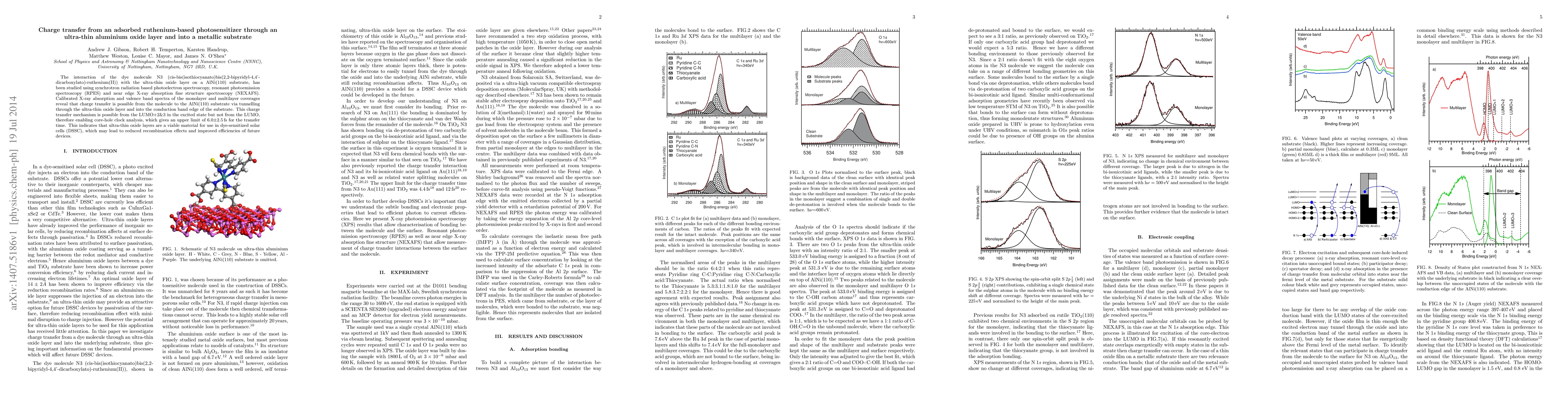 The interaction of the dye molecule N3 (cis-bis(isothiocyanato)bis(2,2-bipyridyl-4,4'-dicarboxylato)-ruthenium(II)) with the ultra-thin oxide layer on a AlNi(110) substrate, has been studied using synchrotron radiation based photoelectron spectroscopy, resonant photoemission spectroscopy (RPES) and near edge X-ray absorption fine structure spectroscopy (NEXAFS). Calibrated X-ray absorption and valence band spectra of the monolayer and multilayer coverages reveal that charge transfer is possible from the molecule to the AlNi(110) substrate via tunnelling through the ultra-thin oxide layer and into the conduction band edge of the substrate. This charge transfer mechanism is possible from the LUMO+2&3 in the excited state but not from the LUMO, therefore enabling core-hole clock analysis, which gives an upper limit of $6.0\pm$2.5fs for the transfer time. This indicates that ultra-thin oxide layers are a viable material for use in dye-sensitized solar cells (DSSC), which may lead to reduced recombination effects and improved efficiencies of future devices.
