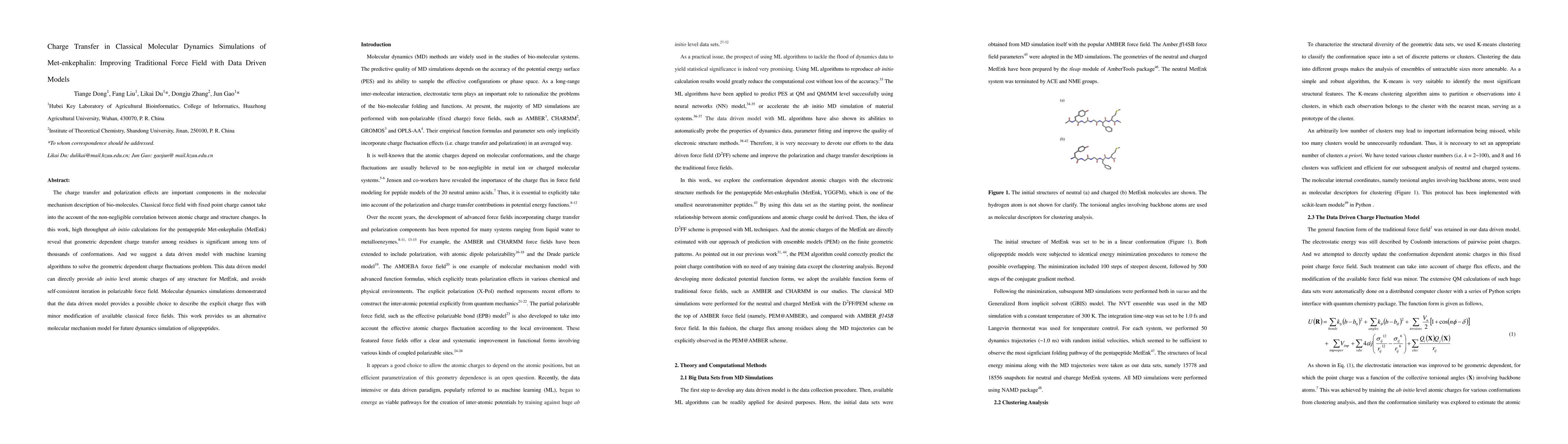 The charge transfer and polarization effects are important components in the molecular mechanism description of bio-molecules. Classical force field with fixed point charge cannot take into the account of the non-negligible correlation between atomic charge and structure changes. In this work, high throughput ab initio calculations for the pentapeptide Met-enkephalin (MetEnk) reveal that geometric dependent charge transfer among residues is significant among tens of thousands of conformations. And we suggest a data driven model with machine learning algorithms to solve the geometric dependent charge fluctuations problem. This data driven model can directly provide ab initio level atomic charges of any structure for MetEnk, and avoids self-consistent iteration in polarizable force field. Molecular dynamics simulations demonstrated that the data driven model provides a possible choice to describe the explicit charge flux with minor modification of available classical force fields. This work provides us an alternative molecular mechanism model for future dynamics simulation of oligopeptides.