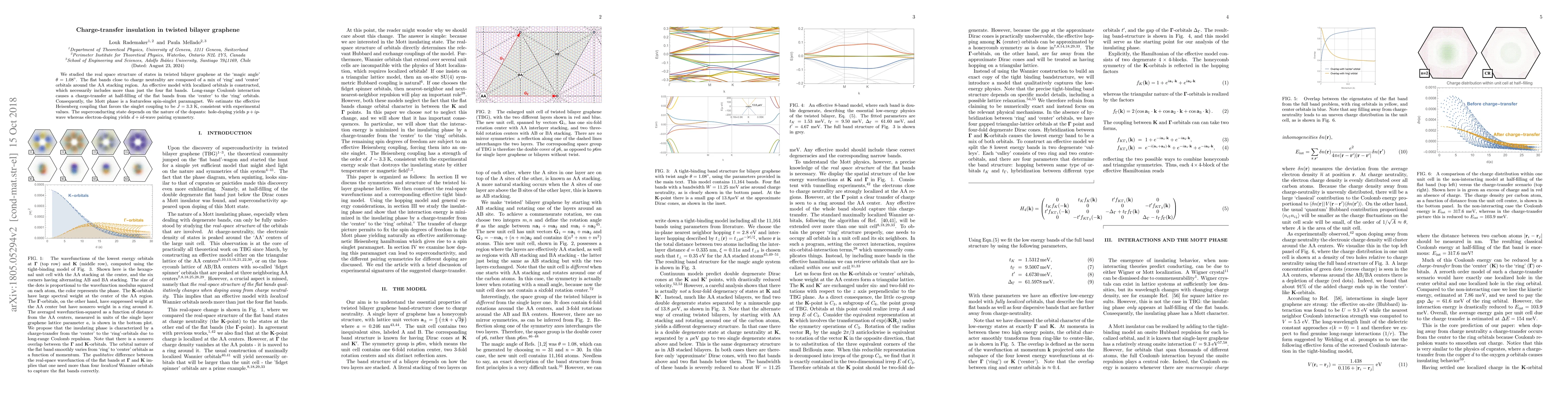 We studied the real space structure of states in twisted bilayer graphene at the `magic angle' $\theta = 1.08^\circ$. The flat bands close to charge neutrality are composed of a mix of `ring' and `center' orbitals around the AA stacking region. An effective model with localized orbitals is constructed, which necessarily includes more than just the four flat bands. Long-range Coulomb interaction causes a charge-transfer at half-filling of the flat bands from the `center' to the `ring' orbitals. Consequently, the Mott phase is a featureless spin-singlet paramagnet. We estimate the effective Heisenberg coupling that favors the singlet coupling to be $J = 3.3$ K, consistent with experimental values. The superconducting state depends on the nature of the dopants: hole-doping yields $p+ip$-wave whereas electron-doping yields $d+id$-wave pairing symmetry.