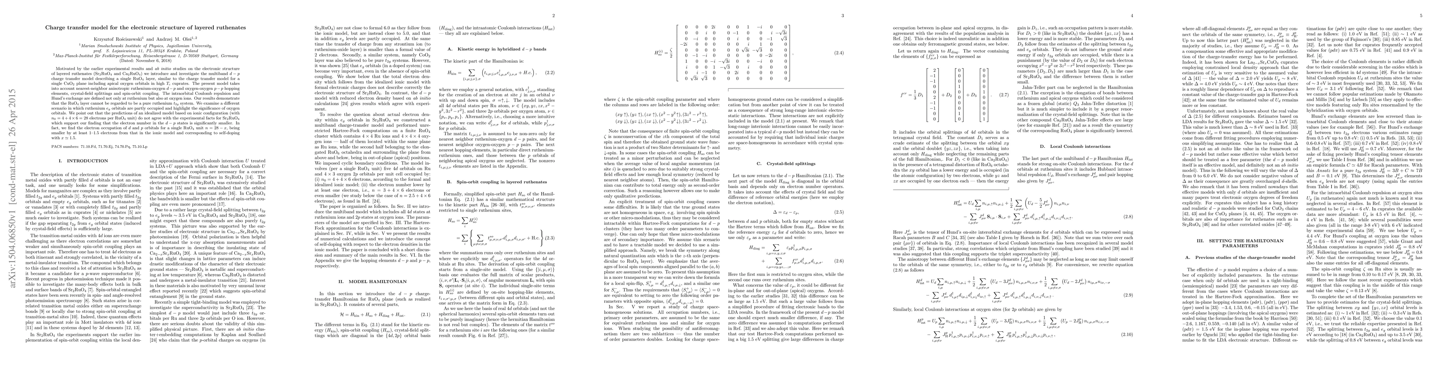 This paper introduces a multiband $d-p$ charge transfer model for layered ruthenates, emphasizing the role of oxygen orbitals and demonstrating that the RuO$_4$ layer is not a pure ruthenium $t_{2g}$ system. The model reveals that the electron number in the $d-p$ states is significantly smaller than predicted by an idealized ionic configuration, indicating self-doping with approximately 1.5 electrons.