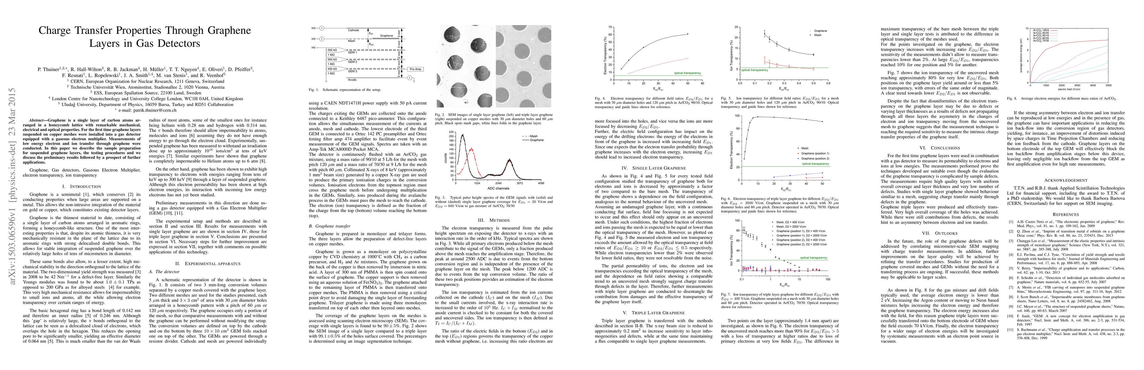 This paper explores the charge transfer properties of graphene layers in gas detectors, detailing the preparation of suspended graphene on copper meshes and initial measurements of electron and ion transfer. The study opens avenues for advanced applications in gas detection technology.