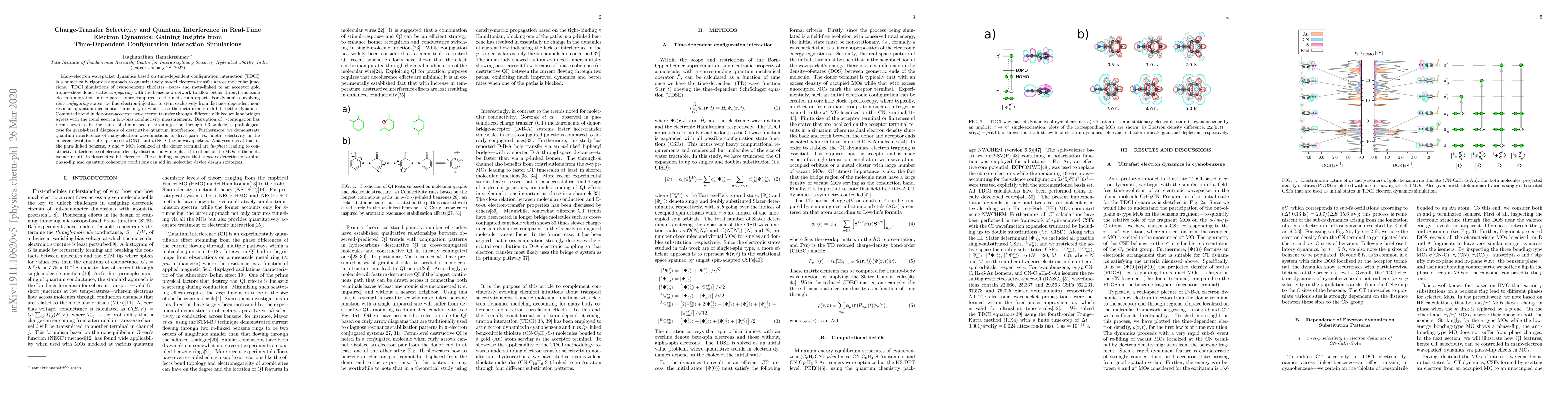 Researchers used time-dependent configuration interaction simulations to study electron dynamics in molecular junctions, finding that conjugation between the donor molecule and the acceptor affects electron transfer rates, while quantum interference plays a crucial role in determining selectivity.