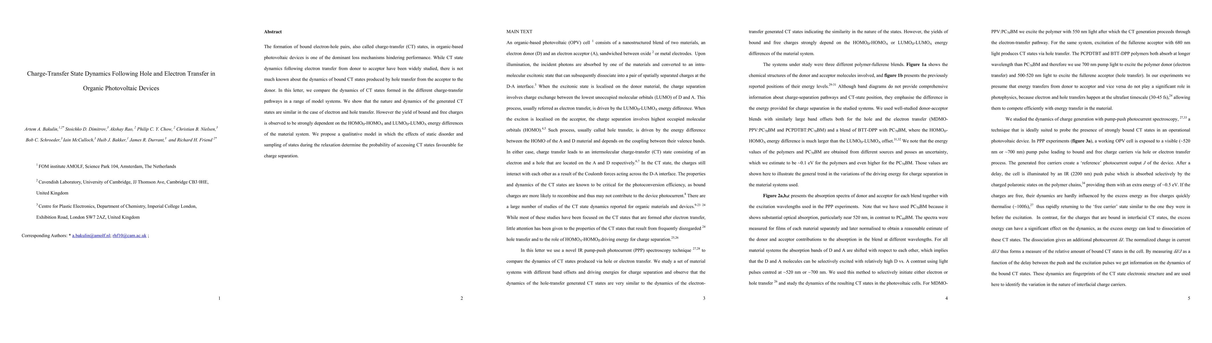 The formation of bound electron-hole pairs, also called charge-transfer (CT) states, in organic-based photovoltaic devices is one of the dominant loss mechanisms hindering performance. While CT state dynamics following electron transfer from donor to acceptor have been widely studied, there is not much known about the dynamics of bound CT states produced by hole transfer from the acceptor to the donor. In this letter, we compare the dynamics of CT states formed in the different charge-transfer pathways in a range of model systems. We show that the nature and dynamics of the generated CT states are similar in the case of electron and hole transfer. However the yield of bound and free charges is observed to be strongly dependent on the HOMOD-HOMOA and LUMOD-LUMOA energy differences of the material system. We propose a qualitative model in which the effects of static disorder and sampling of states during the relaxation determine the probability of accessing CT states favourable for charge separation.