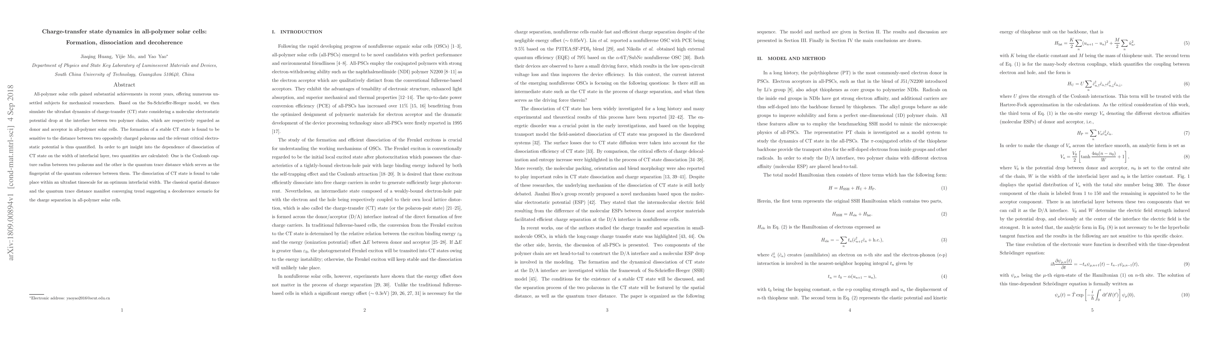 All-polymer solar cells gained substantial achievements in recent years, offering numerous unsettled subjects for mechanical researchers. Based on the Su-Schrieffer-Heeger model, we then simulate the ultrafast dynamics of charge-transfer (CT) state considering a molecular electrostatic potential drop at the interface between two polymer chains, which are respectively regarded as donor and acceptor in all-polymer solar cells. The formation of a stable CT state is found to be sensitive to the distance between two oppositely charged polarons and the relevant critical electrostatic potential is thus quantified. In order to get insight into the dependence of dissociation of CT state on the width of interfacial layer, two quantities are calculated: One is the Coulomb capture radius between two polarons and the other is the quantum trace distance which serves as the fingerprint of the quantum coherence between them. The dissociation of CT state is found to take place within an ultrafast timescale for an optimum interfacial width. The classical spatial distance and the quantum trace distance manifest converging trend suggesting a decoherence scenario for the charge separation in all-polymer solar cells.