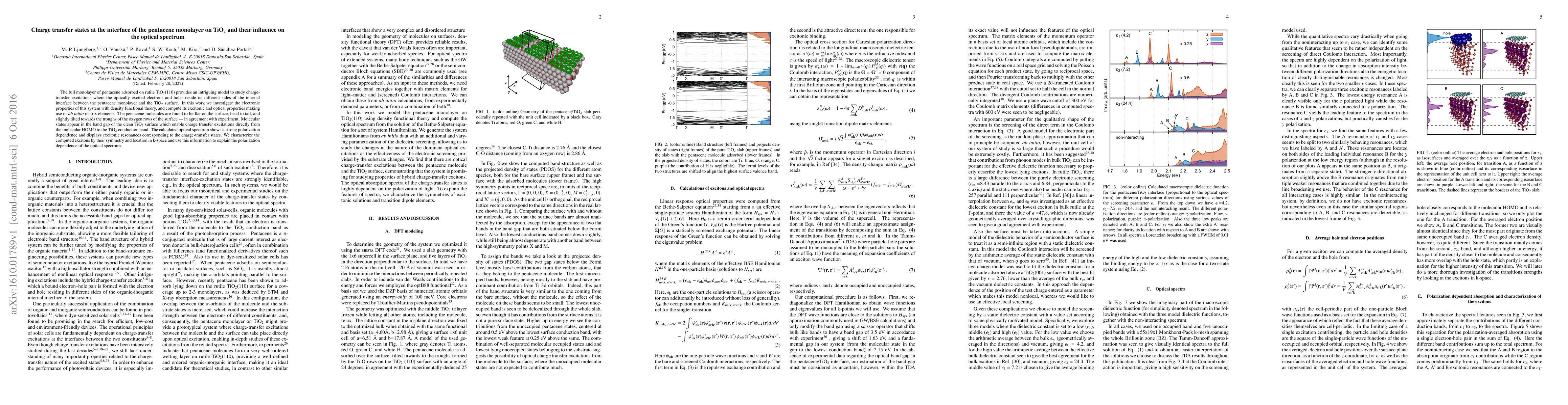 The full monolayer of pentacene adsorbed on rutile TiO$_2$(110) provides an intriguing model to study charge-transfer excitations where the optically excited electrons and holes reside on different sides of the internal interface between the pentacene monolayer and the TiO$_2$ surface. In this work we investigate the electronic properties of this system with density functional theory, and compute its excitonic and optical properties making use of \emph{ab initio} matrix elements. The pentacene molecules are found to lie flat on the surface, head to tail, and slightly tilted towards the troughs of the oxygen rows of the surface --- in agreement with experiment. Molecular states appear in the band gap of the clean TiO$_2$ surface which enable charge transfer excitations directly from the molecular HOMO to the TiO$_2$ conduction band. The calculated optical spectrum shows a strong polarization dependence and displays excitonic resonances corresponding to the charge-transfer states. We characterize the computed excitons by their symmetry and location in k-space and use this information to explain the polarization dependence of the optical spectrum.