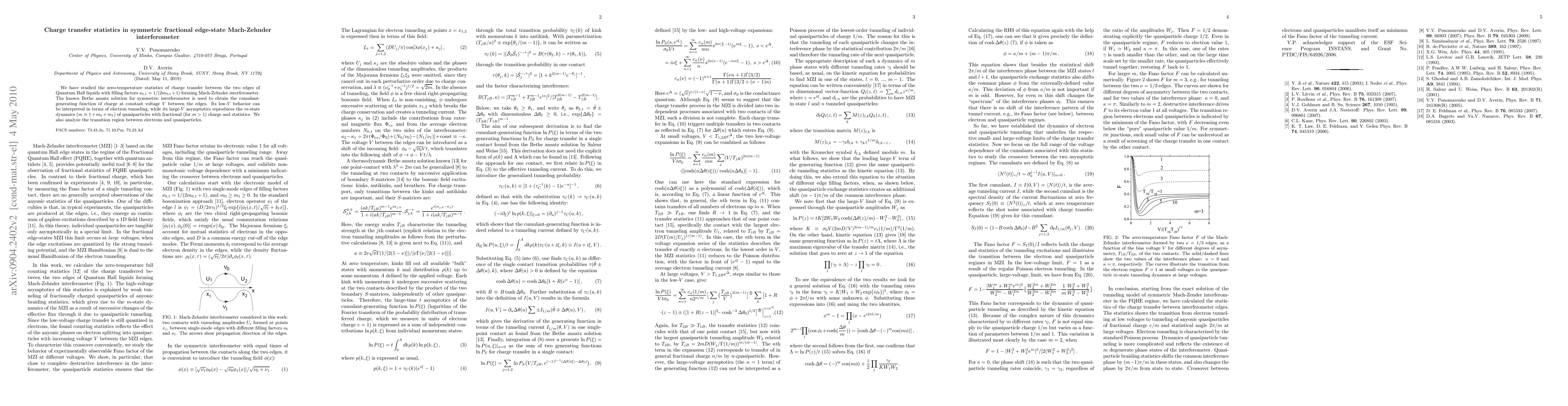 This study investigates the charge transfer statistics in a symmetric fractional edge-state Mach-Zehnder interferometer at zero temperature, using the Bethe ansatz solution to derive the cumulant-generating function. It shows electron tunneling behavior at low voltages and quasiparticle dynamics at high voltages, with a focus on the transition region between these regimes.