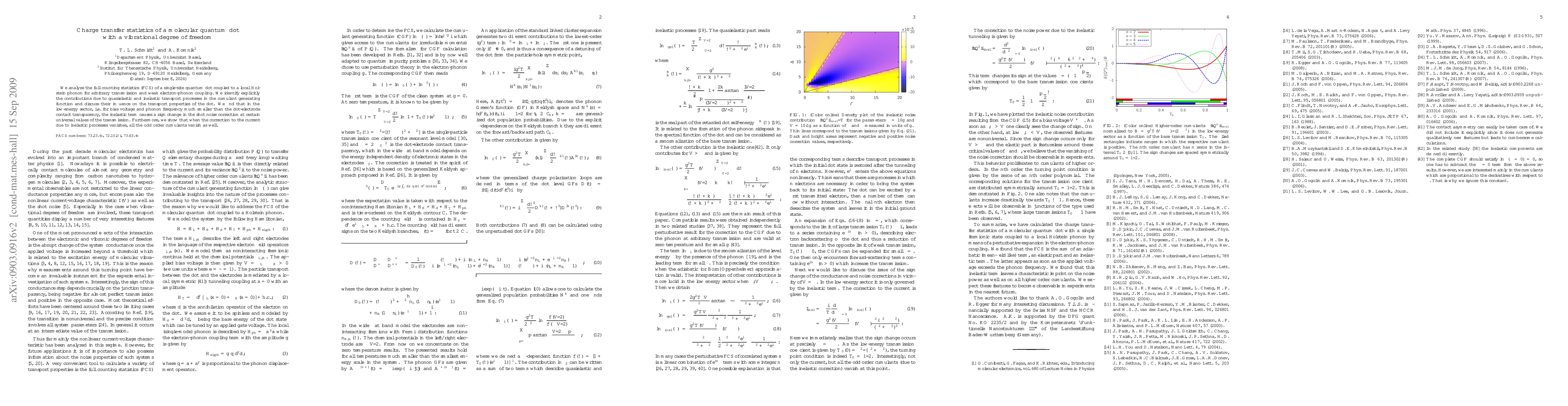 This paper investigates the full counting statistics of a molecular quantum dot with a Holstein phonon, revealing contributions from quasielastic and inelastic transport processes. It finds that inelastic processes cause a sign change in shot noise correction at specific transmission values, and when inelastic current correction vanishes, all odd order cumulants also disappear.