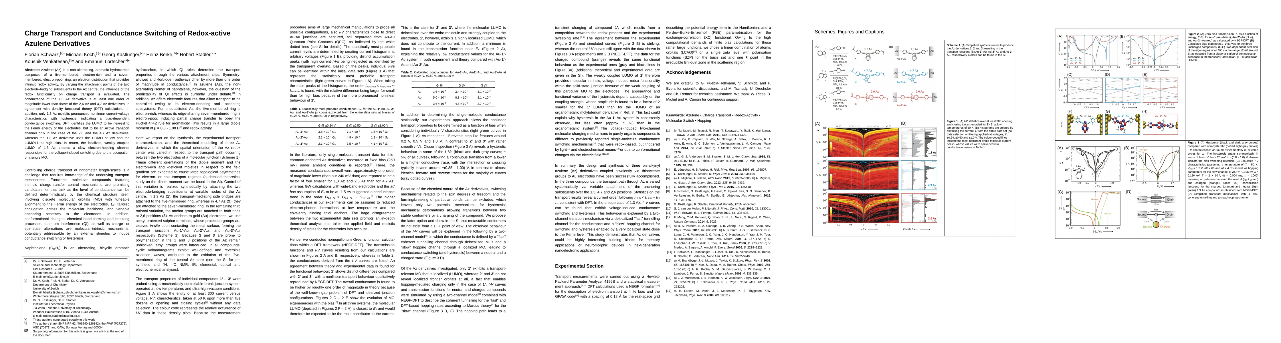 This study investigates the charge transport and conductance switching in redox-active azulene derivatives, finding that the 1,3 derivative exhibits significantly lower conductance and voltage-induced switching due to localized electron-hopping, while the 2,6 and 4,7 derivatives show higher conductance and different transport channels. DFT calculations support these findings, revealing distinct electronic states and transport mechanisms for each derivative.