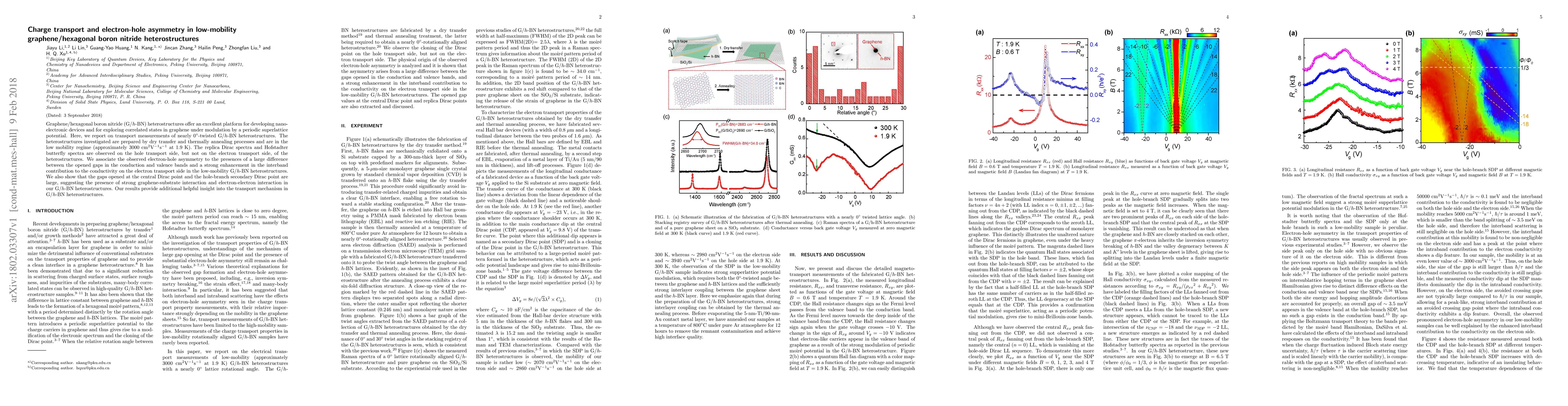 Graphene/hexagonal boron nitride (G/$h$-BN) heterostructures offer an excellent platform for developing nanoelectronic devices and for exploring correlated states in graphene under modulation by a periodic superlattice potential. Here, we report on transport measurements of nearly $0^{\circ}$-twisted G/$h$-BN heterostructures. The heterostructures investigated are prepared by dry transfer and thermally annealing processes and are in the low mobility regime (approximately $3000~\mathrm{cm}^{2}\mathrm{V}^{-1}\mathrm{s}^{-1}$ at 1.9 K). The replica Dirac spectra and Hofstadter butterfly spectra are observed on the hole transport side, but not on the electron transport side, of the heterostructures. We associate the observed electron-hole asymmetry to the presences of a large difference between the opened gaps in the conduction and valence bands and a strong enhancement in the interband contribution to the conductivity on the electron transport side in the low-mobility G/$h$-BN heterostructures. We also show that the gaps opened at the central Dirac point and the hole-branch secondary Dirac point are large, suggesting the presence of strong graphene-substrate interaction and electron-electron interaction in our G/$h$-BN heterostructures. Our results provide additional helpful insight into the transport mechanism in G/$h$-BN heterostructures.