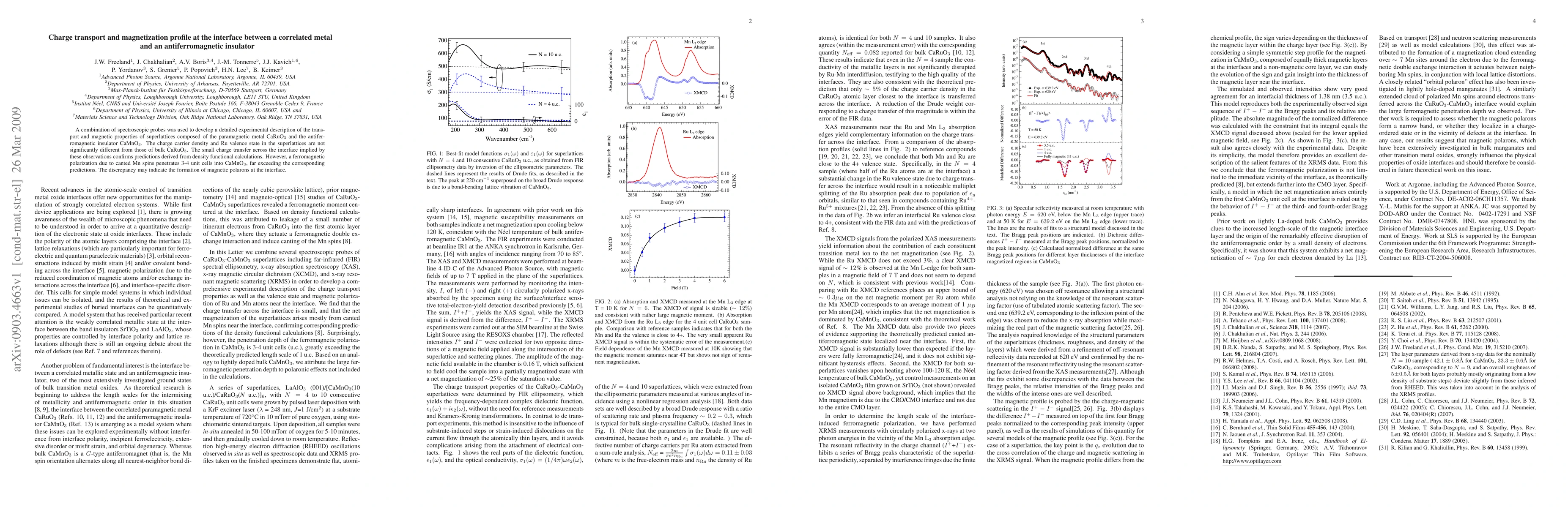 A combination of spectroscopic probes was used to develop a detailed experimental description of the transport and magnetic properties of superlattices composed of the paramagnetic metal CaRuO$_3$ and the antiferromagnetic insulator CaMnO$_3$. The charge carrier density and Ru valence state in the superlattices are not significantly different from those of bulk CaRuO$_3$. The small charge transfer across the interface implied by these observations confirms predictions derived from density functional calculations. However, a ferromagnetic polarization due to canted Mn spins penetrates 3-4 unit cells into CaMnO$_3$, far exceeding the corresponding predictions. The discrepancy may indicate the formation of magnetic polarons at the interface.