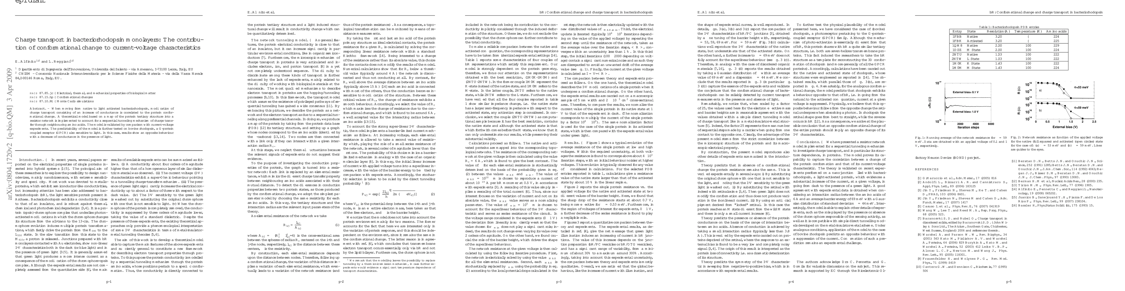 When moving from native to light activated bacteriorhodopsin, modification of charge transport consisting of an increase of conductance is correlated to the protein conformational change. A theoretical model based on a map of the protein tertiary structure into a resistor network is implemented to account for a sequential tunneling mechanism of charge transfer through neighbouring amino acids. The model is validated by comparison with current-voltage experiments. The predictability of the model is further tested on bovine rhodopsin, a G-protein coupled receptor (GPCR) also sensitive to light. In this case, results show an opposite behaviour with a decrease of conductance in the presence of light.