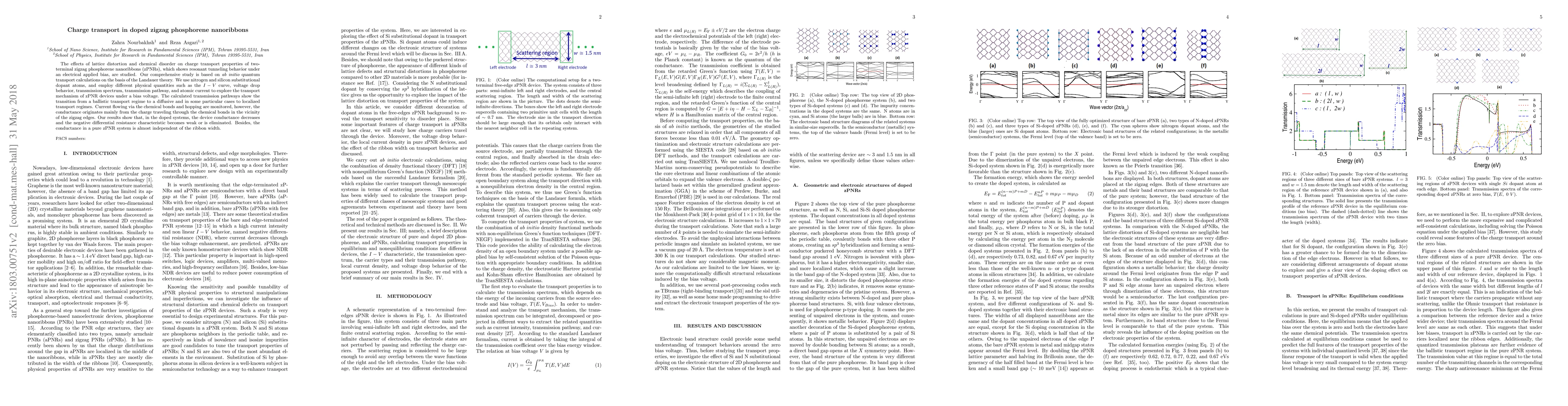 The effects of lattice distortion and chemical disorder on charge transport properties of two-terminal zigzag phosphorene nanoribbons (zPNRs), which shows resonant tunneling behavior under an electrical applied bias, are studied. Our comprehensive study is based on an {\it ab~initio} quantum transport calculations on the basis of the Landauer theory. We use nitrogen and silicon substitutional dopant atoms, and employ different physical quantities such as $I-V$ curve, voltage drop behavior, transmission spectrum, transmission pathway, and atomic current, to explore the transport mechanism of zPNR devices under a bias voltage. The calculated transmission pathways show the transition from a ballistic transport regime to a diffusive and in some particular cases to localized transport regimes. Current flowing via the chemical bonds and hopping are monitored, however, the conductance originates mainly from a charge traveling through the chemical bonds in the vicinity of the zigzag edges. Our results show that, in the doped systems, the device conductance decreases and negative differential resistance characteristic becomes weak or eliminates. Besides, the conductance in a pure zPNR system is almost independent of the ribbon width.
