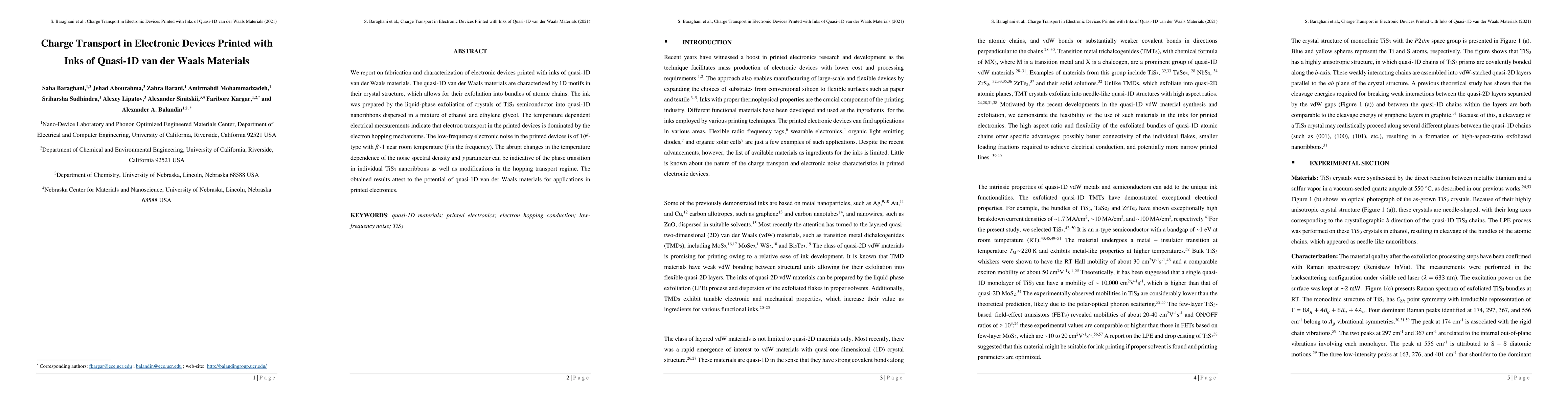 This paper investigates electronic devices printed with quasi-1D van der Waals material inks, specifically TiS3 nanoribbons, and finds electron transport dominated by hopping mechanisms. The study highlights potential applications of these materials in printed electronics due to observed phase transitions and noise characteristics.
