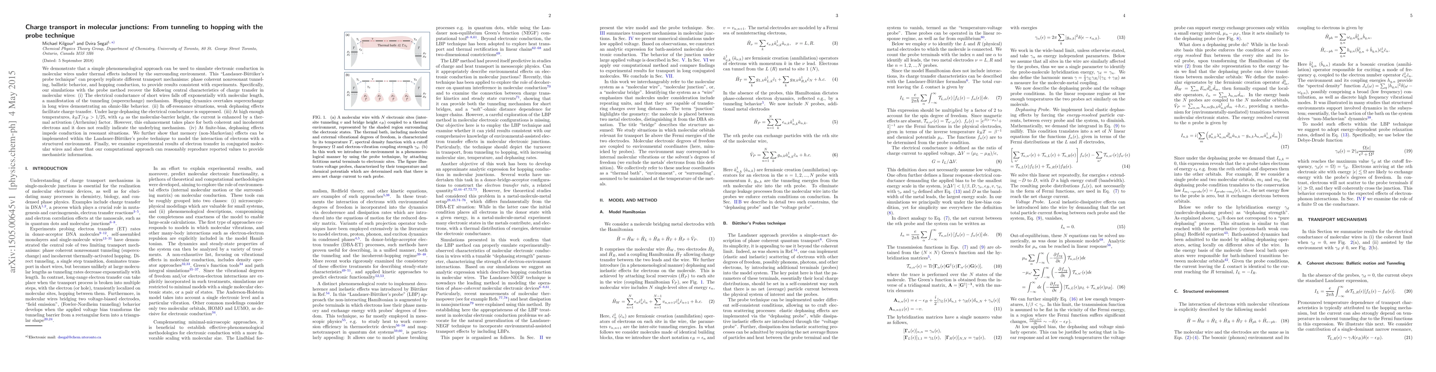 This paper uses Landauer-Büttiker's probe technique to simulate charge transport in molecular junctions, capturing tunneling, ballistic, and hopping mechanisms. The study reveals that conductance decreases exponentially with length in short wires, while long wires exhibit ohmic behavior due to hopping, and thermal activation enhances current at high temperatures.