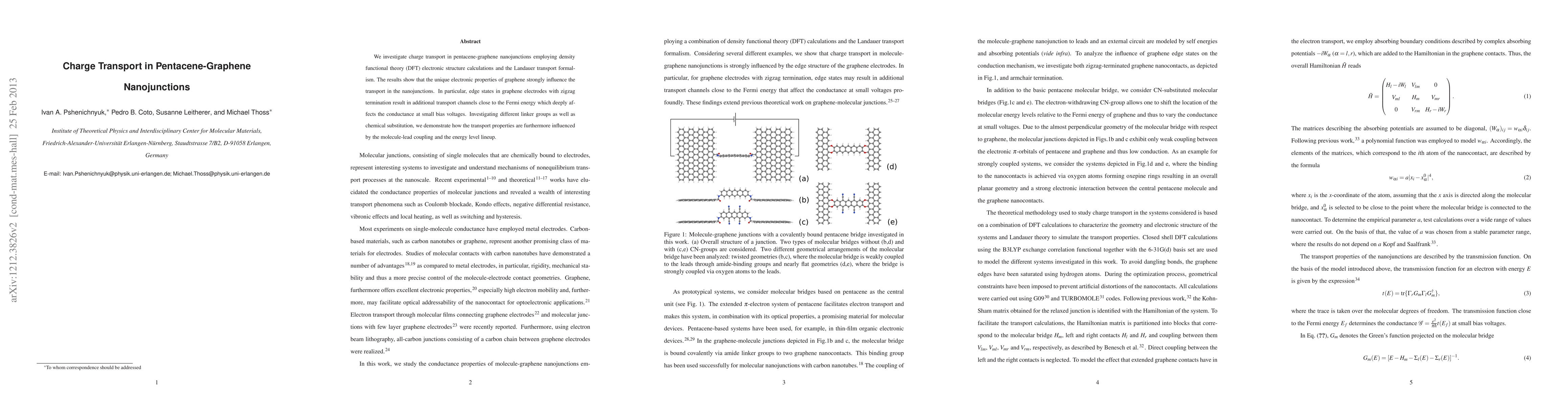 This study uses density functional theory and Landauer formalism to explore charge transport in pentacene-graphene nanojunctions, revealing that graphene's edge states enhance conductance at low biases. The research also shows how linker groups and chemical substitutions influence transport via molecule-lead coupling and energy level alignment.