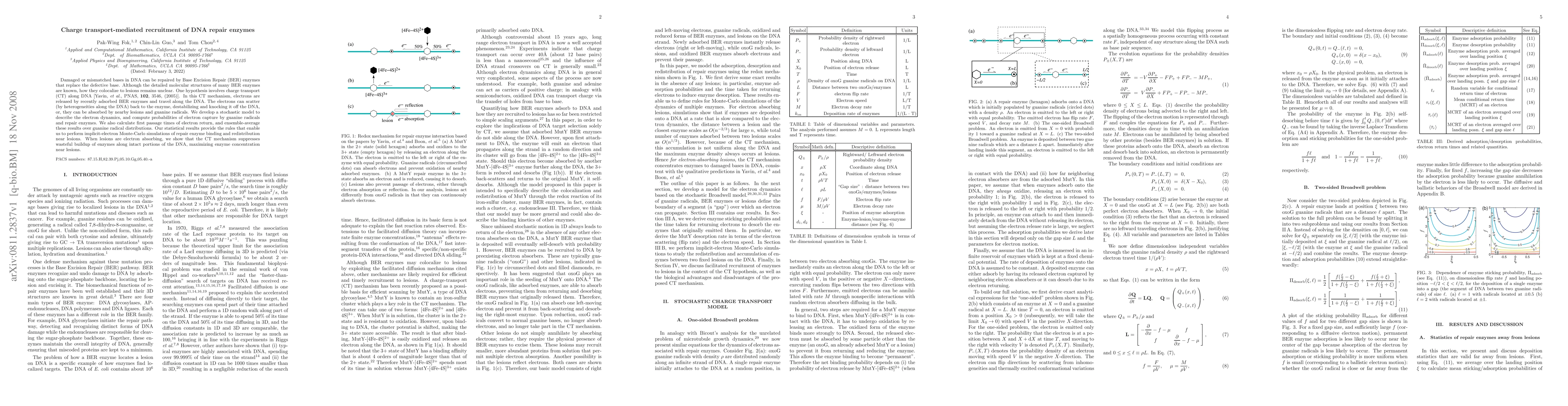 This paper proposes a charge transport mechanism for the recruitment of DNA repair enzymes to damaged sites, modeling electron dynamics to show how enzymes localize to lesions. The study finds that electron absorption by lesions enhances enzyme concentration near damage, minimizing enzyme accumulation on undamaged DNA.
