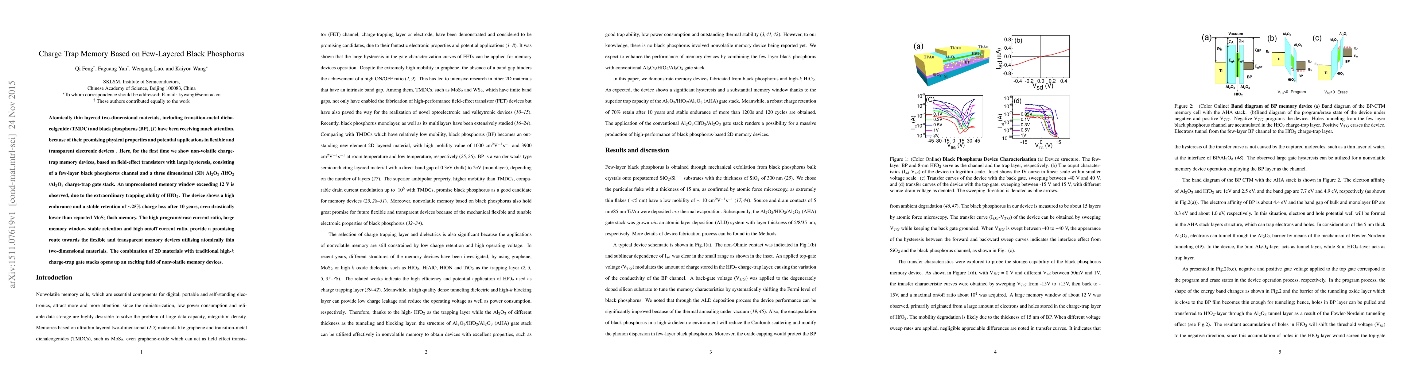 This paper demonstrates a non-volatile charge-trap memory device based on few-layered black phosphorus with a large memory window of over 12 V and exceptional retention stability, showcasing the potential for flexible and transparent memory applications. The device's combination of 2D black phosphorus with high-k charge-trap gate stacks marks a significant advancement in nonvolatile memory technology.