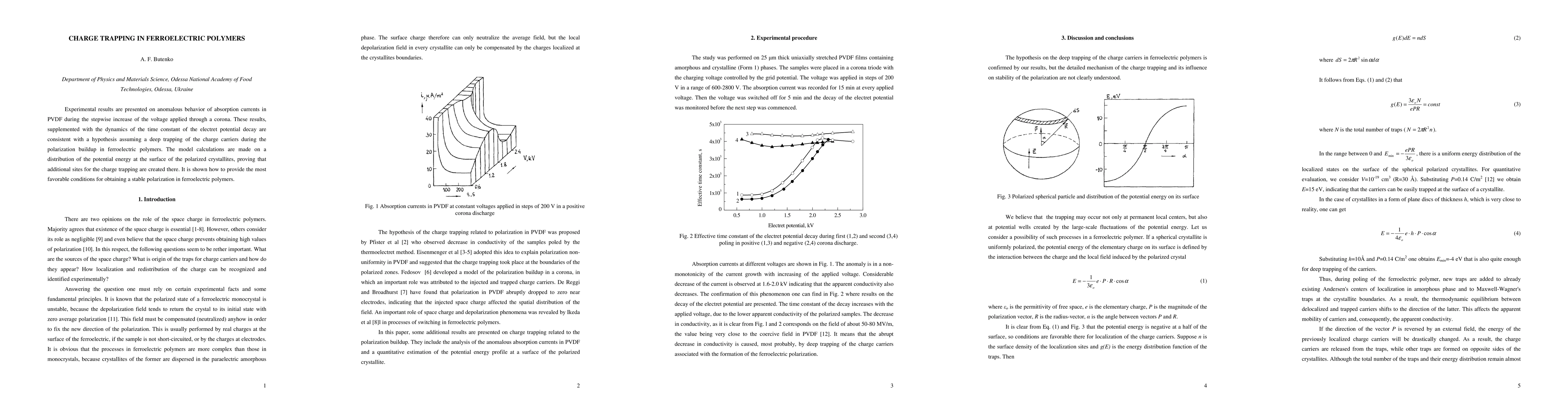 This study investigates charge trapping in PVDF ferroelectric polymers, finding anomalous absorption currents and potential decay dynamics suggesting deep trapping of charge carriers during polarization. Model calculations reveal additional charge trapping sites on the surface of polarized crystallites.