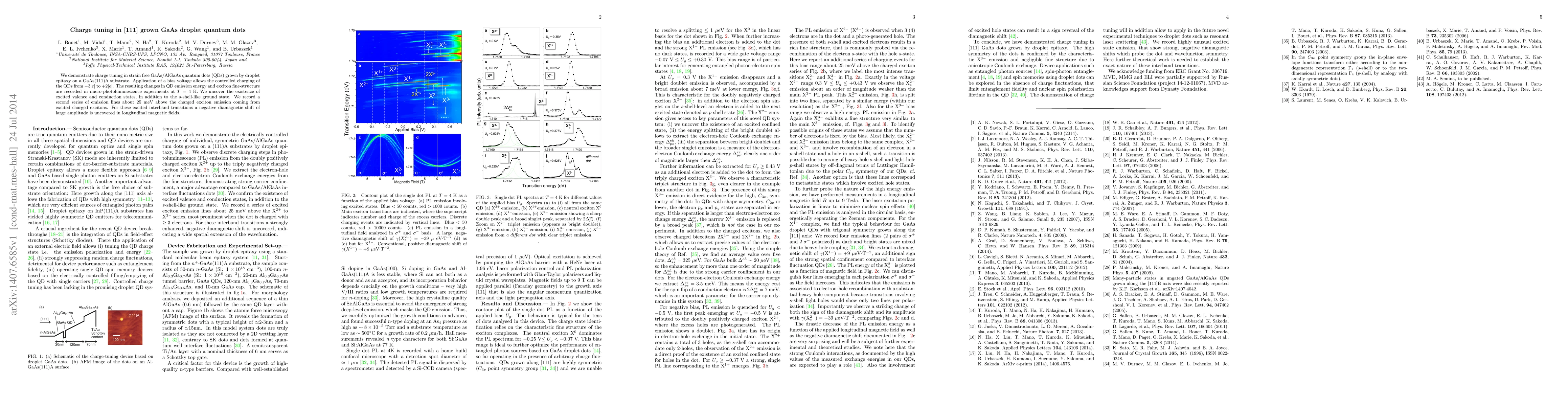We demonstrate charge tuning in strain free GaAs/AlGaAs quantum dots (QDs) grown by droplet epitaxy on a GaAs(111)A substrate. Application of a bias voltage allows the controlled charging of the QDs from $-3|e|$ to $+2|e|$. The resulting changes in QD emission energy and exciton fine-structure are recorded in micro-photoluminescence experiments at T=4K. We uncover the existence of excited valence and conduction states, in addition to the s-shell-like ground state. We record a second series of emission lines about 25meV above the charged exciton emission coming from excited charged excitons. For these excited interband transitions a negative diamagnetic shift of large amplitude is uncovered in longitudinal magnetic fields.