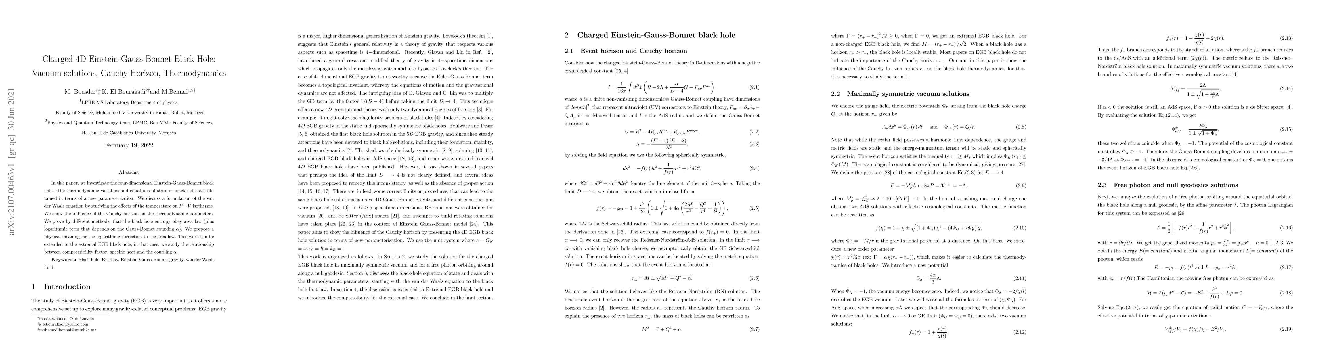 In this paper, we investigate the four-dimensional Einstein-Gauss-Bonnet black hole. The thermodynamic variables and equations of state of black holes are obtained in terms of a new parameterization. We discuss a formulation of the van der Waals equation by studying the effects of the temperature on P-V isotherms. We show the influence of the Cauchy horizon on the thermodynamic parameters. We prove by different methods, that the black hole entropy obey area law (plus logarithmic term that depends on the Gauss-Bonnet coupling {\alpha}). We propose a physical meaning for the logarithmic correction to the area law. This work can be extended to the extremal EGB black hole, in that case, we study the relationship between compressibility factor, specific heat and the coupling {\alpha}.
