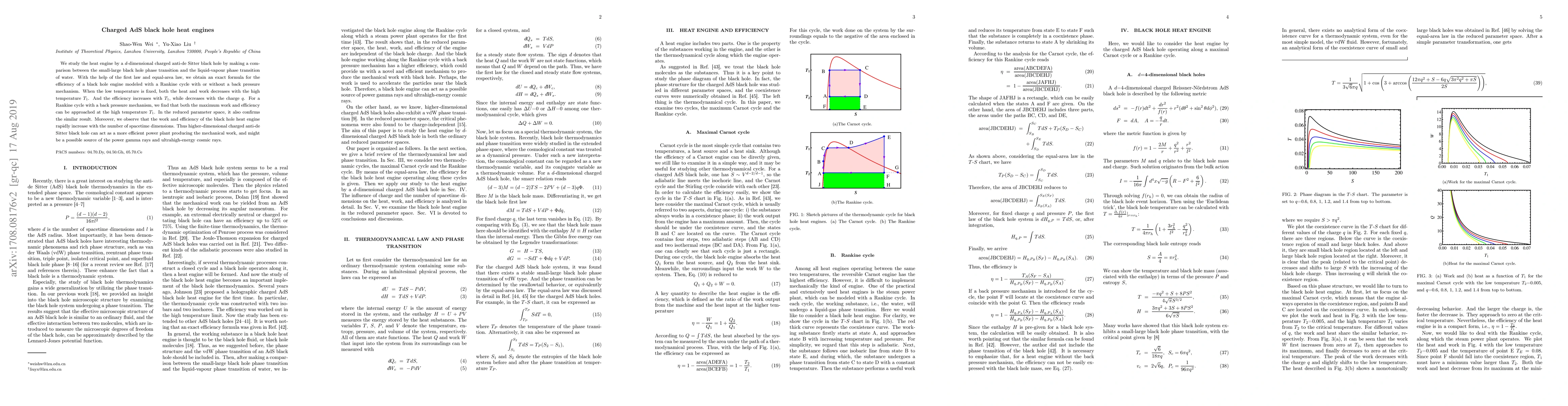 We study the heat engine by a $d$-dimensional charged anti-de Sitter black hole by making a comparison between the small-large black hole phase transition and the liquid-vapour phase transition of water. With the help of the first law and equal-area law, we obtain an exact formula for the efficiency of a black hole engine modeled with a Rankine cycle with or without a back pressure mechanism. When the low temperature is fixed, both the heat and work decreases with the high temperature $T_{1}$. And the efficiency increases with $T_{1}$, while decreases with the charge $q$. For a Rankine cycle with a back pressure mechanism, we find that both the maximum work and efficiency can be approached at the high temperature $T_{1}$. In the reduced parameter space, it also confirms the similar result. Moreover, we observe that the work and efficiency of the black hole heat engine rapidly increase with the number of spacetime dimensions. Thus higher-dimensional charged anti-de Sitter black hole can act as a more efficient power plant producing the mechanical work, and might be a possible source of the power gamma rays and ultrahigh-energy cosmic rays.