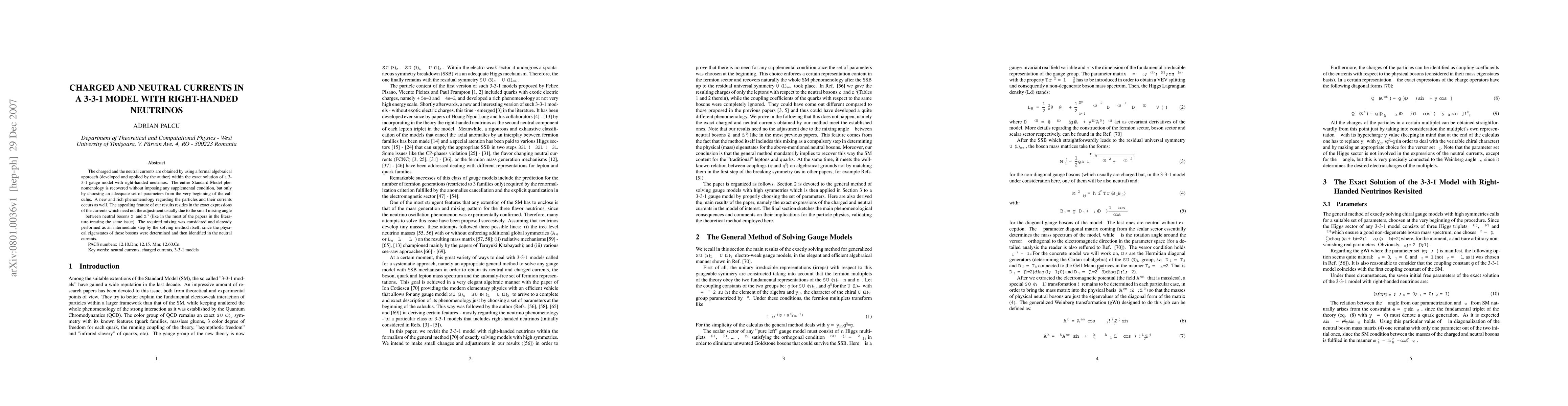 The charged and the neutral currents are obtained by using a formal algebraical approach (developed and applied by the author) within the exact solution of a 3-3-1 gauge model with right-handed neutrinos. The entire Standard Model phenomenology is recovered without imposing any supplemental condition, but only by choosing an adecquate set of parameters from the very beginning of the calculus. A new and rich phenomenology regarding the particles and their currents occurs as well. The appealing feature of our results resides in the exact expressions of the currents which need not the adjustment usually due to the small mixing angle $\phi$ between neutral bosons $Z$ and $Z^{\prime}$ (like in the most of the papers in the literature treating the same issue). The required mixing was considered and aleready performed as an intermediate step by the solving method itself, since the physical eigenstates of those bosons were determined and then identified in the neutral currents.
