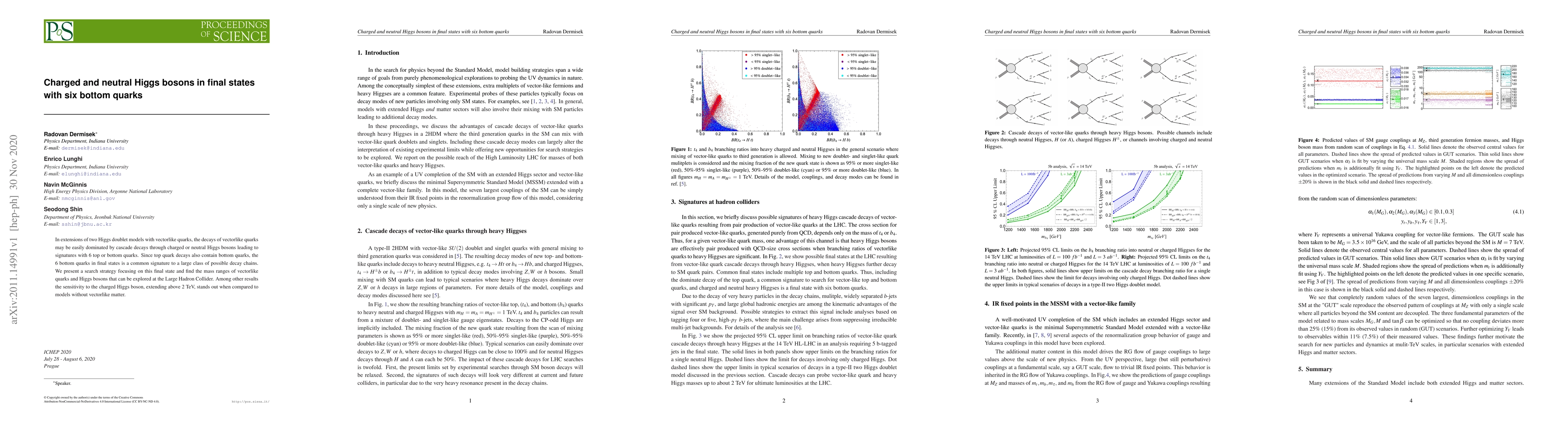 This paper explores decay signatures in extended two Higgs doublet models featuring vectorlike quarks, focusing on final states with six bottom quarks. The study presents a search strategy for the Large Hadron Collider, identifying mass ranges for vectorlike quarks and Higgs bosons, with notable sensitivity to charged Higgs bosons above 2 TeV.