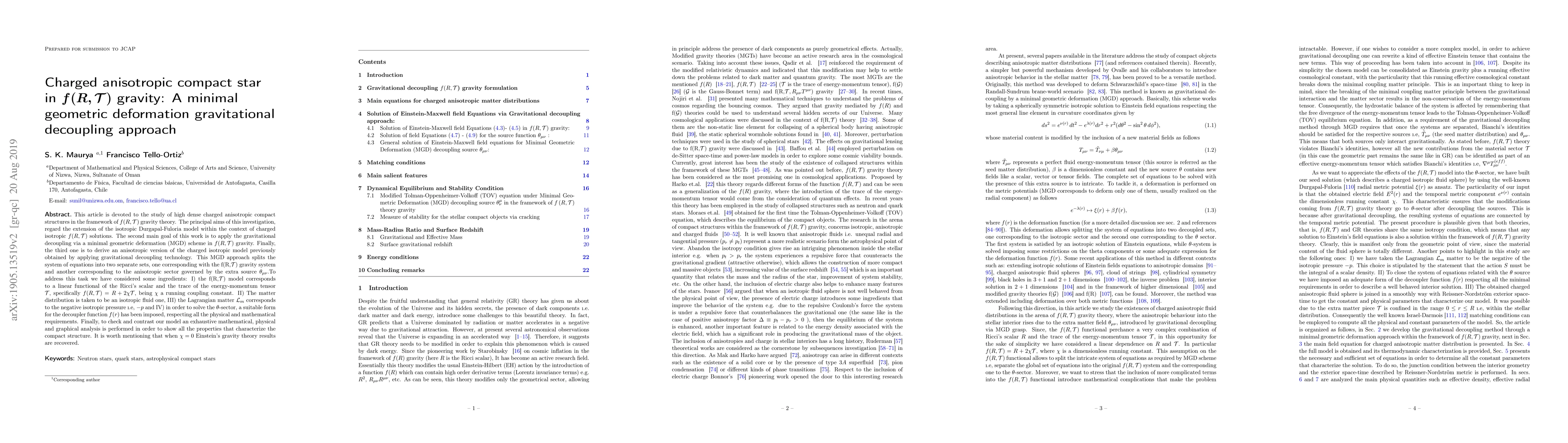 This article is devoted to the study of high dense charged anisotropic compact structures in the framework of $f(R,\mathcal{T})$ gravity theory. The principal aims of this investigation, regard the extension of the isotropic Durgapal-Fuloria model within the context of charged isotropic $f(R,\mathcal{T})$ solutions. The second main goal of this work is to apply the gravitational decoupling via a minimal geometric deformation (MGD) scheme in $f(R,\mathcal{T})$ gravity. Finally, the third one is to derive an anisotropic version of the charged isotropic model previously obtained by applying gravitational decoupling technology. This MGD approach splits the system of equations into two separate sets, one corresponding with the f(R,$\mathcal{T}$) gravity system and another corresponding to the anisotropic sector governed by the extra source $\theta_{\mu\nu}$.To address this task we have considered some ingredients: I) the f(R,$\mathcal{T}$) model corresponds to a linear functional of the Ricci's scalar and the trace of the energy-momentum tensor $\mathcal{T}$, specifically $ f(R,\mathcal{T}) =R+2\chi\mathcal{T}$, being $\chi$ a running coupling constant. II) The matter distribution is taken to be an isotropic fluid one, III) the Lagrangian matter $\mathcal{L}_{m}$ corresponds to the negative isotropic pressure \i.e, $-p$ and IV) in order to solve the $\theta$-sector, a suitable form for the decoupler function $f(r)$ has been imposed, respecting all the physical and mathematical requirements. Finally, to check and contrast our model an exhaustive mathematical, physical and graphical analysis is performed in order to show all the properties that characterize the compact structure. It is worth mentioning that when $\chi=0$ Einstein's gravity theory results are recovered.