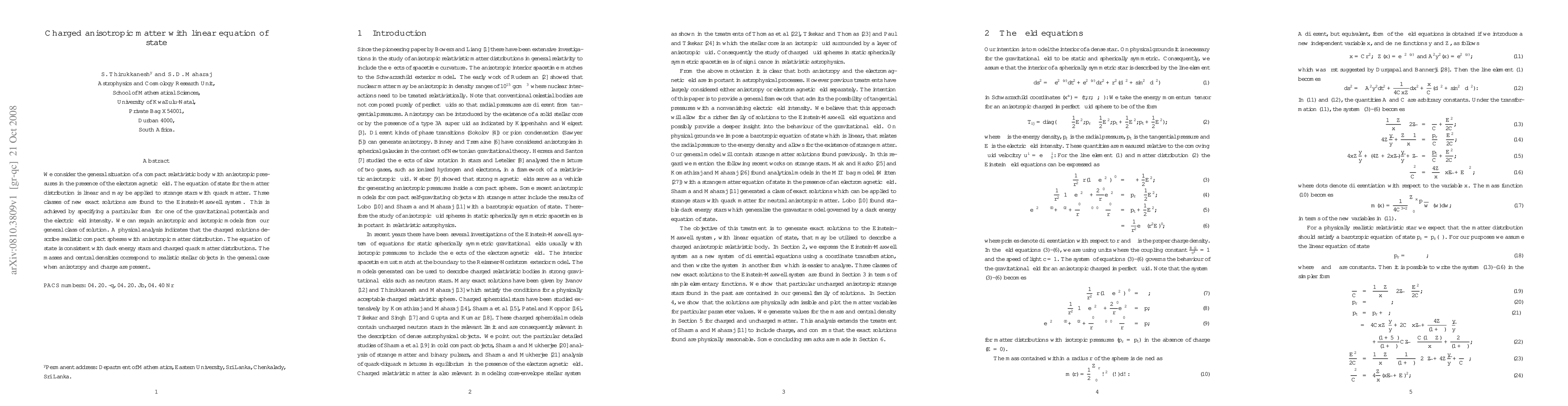 This paper explores charged anisotropic matter with a linear equation of state in relativistic compact bodies, finding three new exact solutions to the Einstein-Maxwell system. The solutions describe realistic compact spheres and are consistent with strange stars and dark energy stars, with masses and densities matching those of realistic stellar objects.