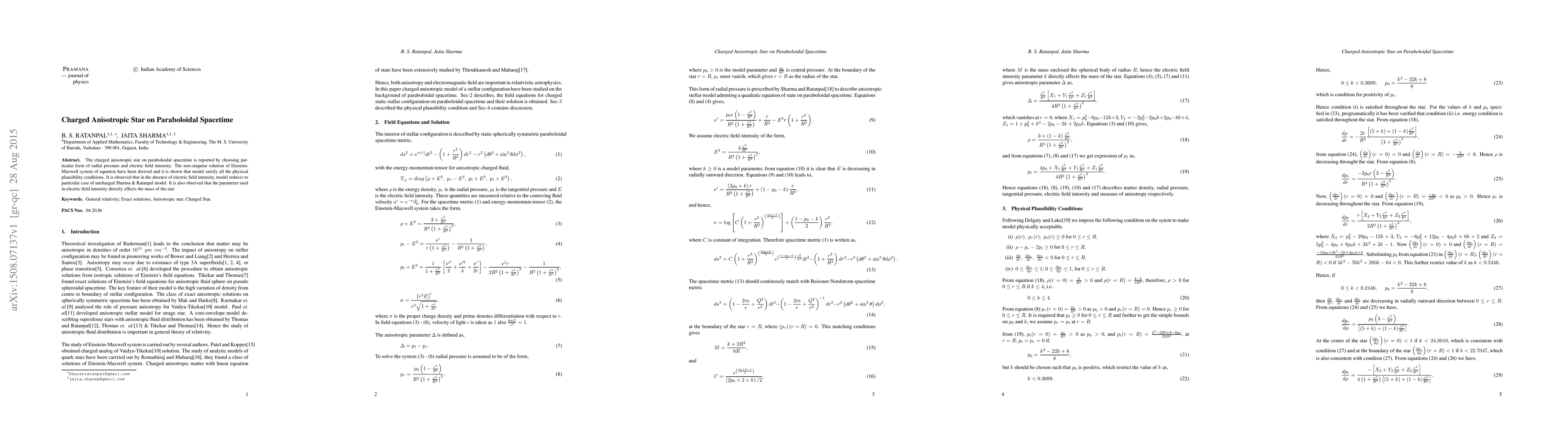 The charged anisotropic star on paraboloidal spacetime is reported by choosing particular form of radial pressure and electric field intensity. The non-singular solution of Einstein-Maxwell system of equation have been derived and it is shown that model satisfy all the physical plausibility conditions. It is observed that in the absence of electric field intensity, model reduces to particular case of uncharged Sharma \& Ratanpal model. It is also observed that the parameter used in electric field intensity directly effects the mass of the star.