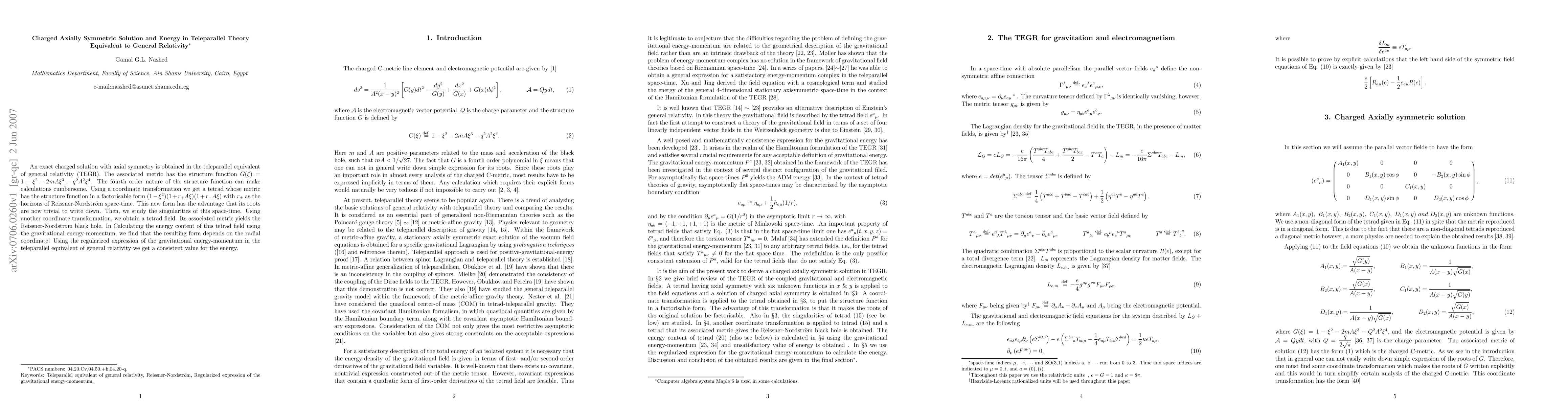 An exact charged solution with axial symmetry is obtained in the teleparallel equivalent of general relativity (TEGR). The associated metric has the structure function $G(\xi)=1-{\xi}^2-2mA{\xi}^3-q^2A^2{\xi}^4$. The fourth order nature of the structure function can make calculations cumbersome. Using a coordinate transformation we get a tetrad whose metric has the structure function in a factorisable form $(1-{\xi}^2)(1+r_{+}A\xi)(1+r_{-}A\xi)$ with $r_{\pm}$ as the horizons of Reissner-Nordstr$\ddot{o}$m space-time. This new form has the advantage that its roots are now trivial to write down. Then, we study the singularities of this space-time. Using another coordinate transformation, we obtain a tetrad field. Its associated metric yields the Reissner-Nordstr$\ddot{o}$m black hole. In Calculating the energy content of this tetrad field using the gravitational energy-momentum, we find that the resulting form depends on the radial coordinate! Using the regularized expression of the gravitational energy-momentum in the teleparallel equivalent of general relativity we get a consistent value for the energy.