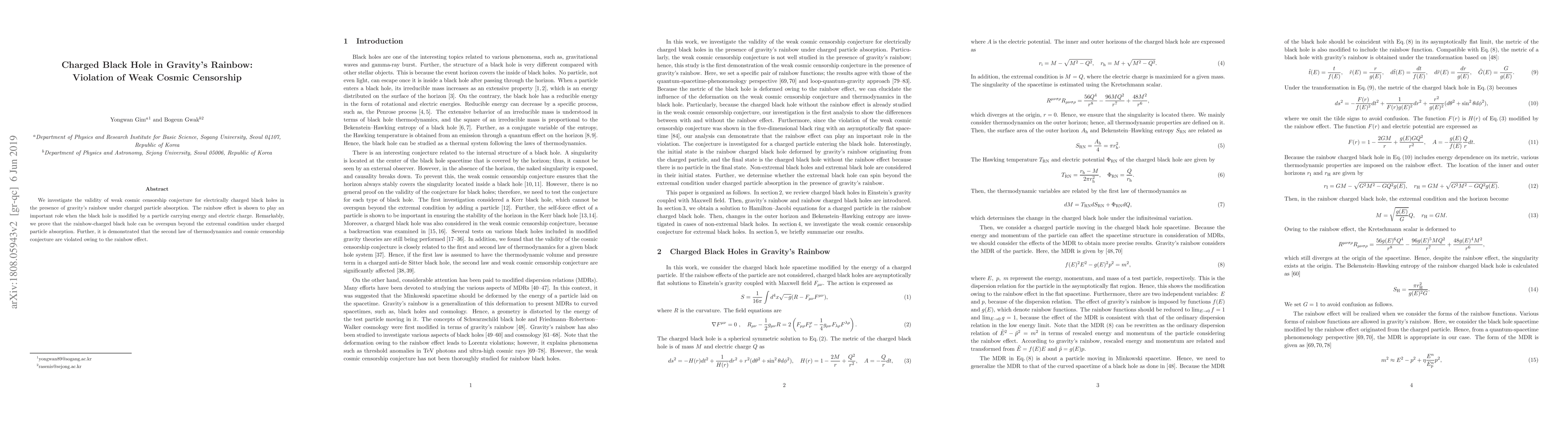 This study reveals that gravity's rainbow modifies the behavior of charged black holes, potentially leading to overspinning beyond extremality and violating the weak cosmic censorship conjecture, along with the second law of thermodynamics. The rainbow effect significantly influences black hole dynamics upon charged particle absorption.