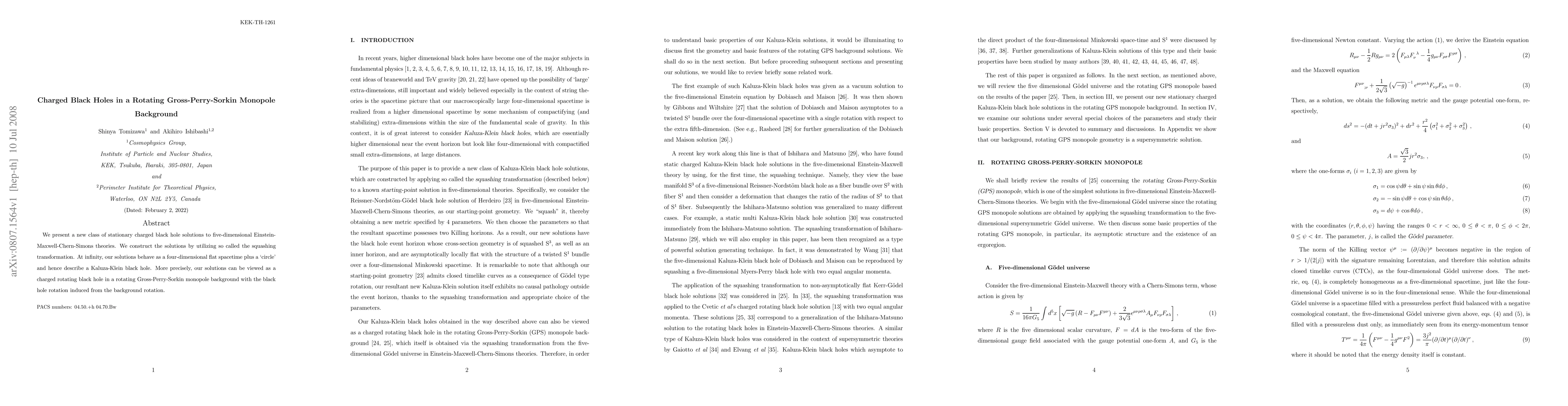We present a new class of stationary charged black hole solutions to five-dimensional Einstein-Maxwell-Chern-Simons theories. We construct the solutions by utilizing so called the squashing transformation. At infinity, our solutions behave as a four-dimensional flat spacetime plus a `circle' and hence describe a Kaluza-Klein black hole. More precisely, our solutions can be viewed as a charged rotating black hole in a rotating Gross-Perry-Sorkin monopole background with the black hole rotation induced from the background rotation.