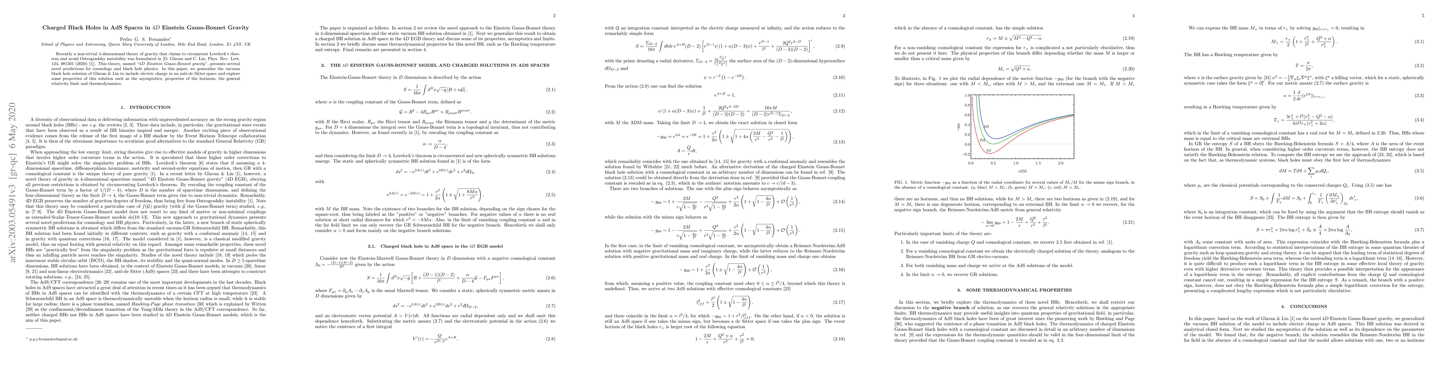 This paper extends the vacuum black hole solution of $4D$ Einstein Gauss-Bonnet gravity to include charged configurations in an anti-de Sitter space, examining the solution's asymptotics, horizon properties, general relativity limit, and thermodynamics. The study explores novel predictions of this gravity theory for black hole physics.