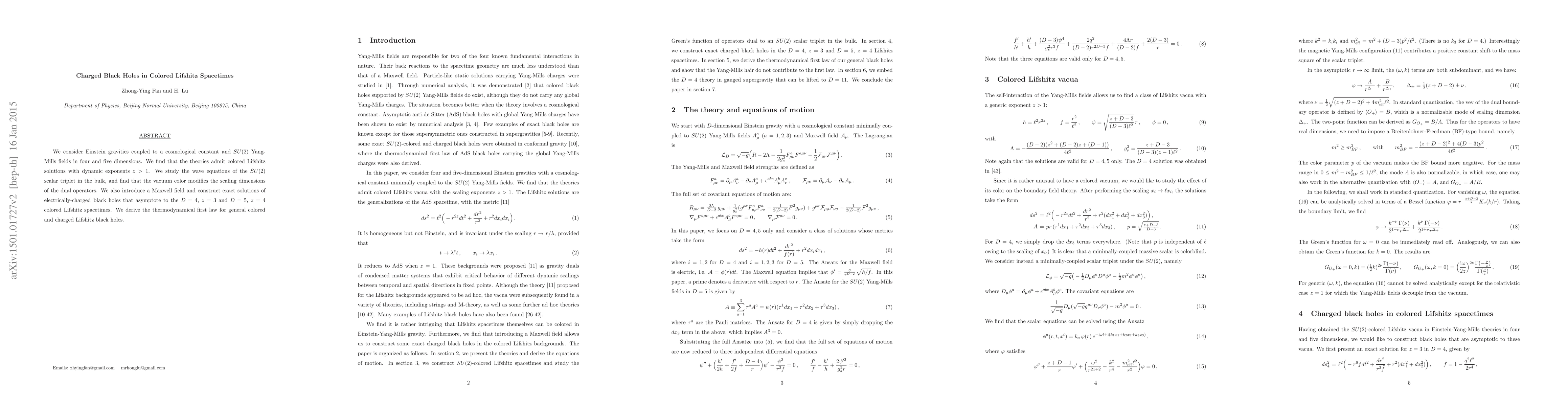 This paper explores Einstein gravities with $SU(2)$ Yang-Mills fields in four and five dimensions, discovering colored Lifshitz solutions with dynamic exponents greater than one. It constructs exact solutions for electrically-charged black holes in these spacetimes, deriving the thermodynamical first law for such black holes.